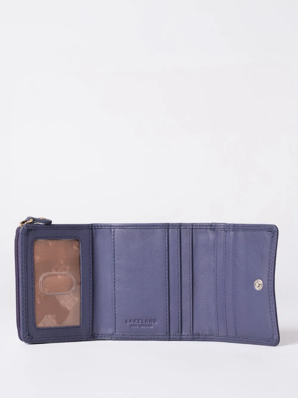 Compact at first glance, when you open this flapover leather purse from Lakeland Leather, you may be surprised at just how much it can hold. The press-stud flap opens to reveal a zipped coin section, which in turn opens to reveal six card slots and an ID window, plus a lined slip pocket for notes. Plus, there s an RFID lining to keep your card data secure. Height 9cm Width 10cm Depth 4cm 100% Leather.
