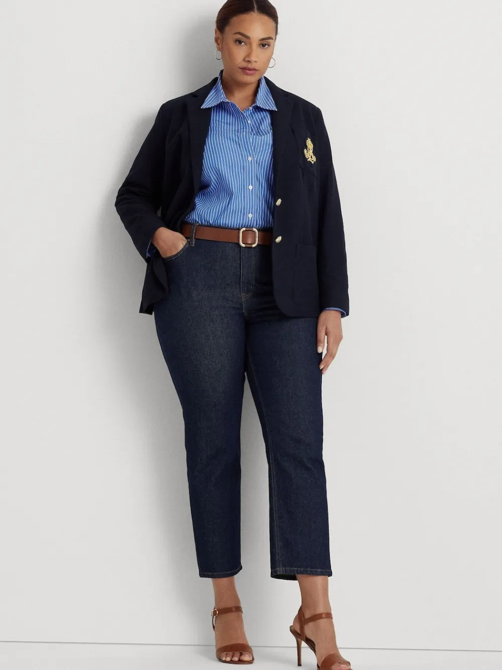 This chic navy jacquard blazer embodies Lauren’s style with a signature bullion patch on the chest and luxurious crest-embossed buttons. Slim fit Designed to hit at the hip UK size 2X has a 68.6 cm body length and an 85.1 cm sleeve length Body length and sleeve length are taken from the centre back of the neck Sleeve length changes by 2.5 cm between sizes Notch lapels Two-button silhouette The model is 175 cm and wears a UK size 1X. Outer 98% Cotton, 2% Elastane. Lining 94% Polyester, 6% Elastane.