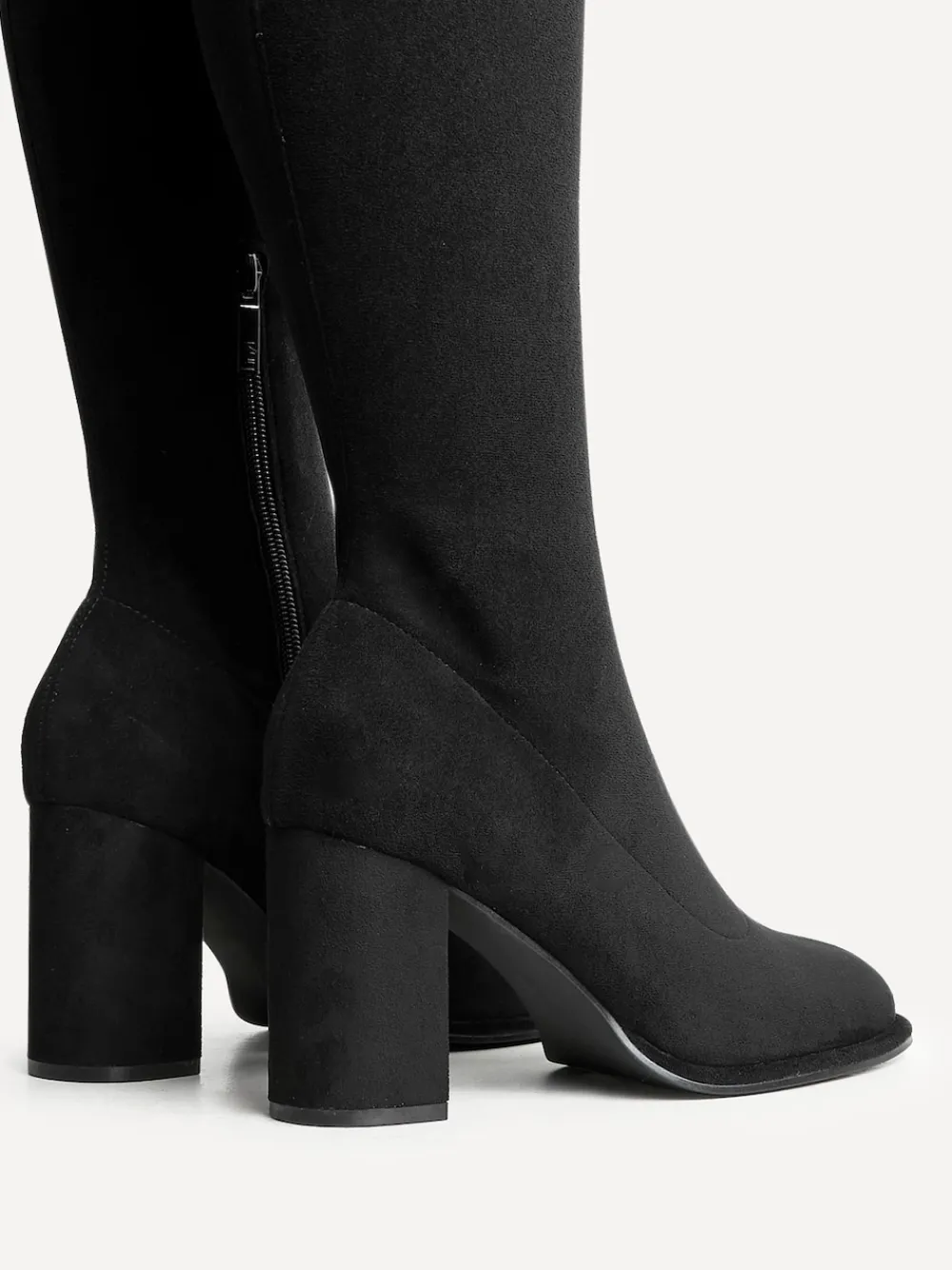 Featuring a sleek block heel and a smooth round toe, this faux suede boot blends comfort with style. A versatile statement piece perfect for any occasion. Made with a soft cushioned innersock for all evening comfort. Boot Length: 39cm. Heel height 8.5cm. Upper – Textile, Lining & Sock – Textile, Sole – Other Materials.