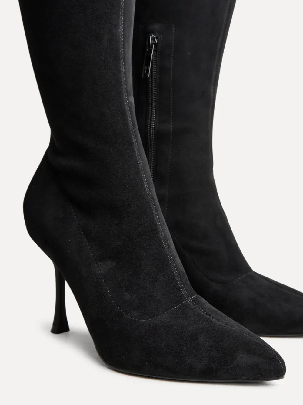 Introducing Laney, our sleek and statement-making boots. Elevate your style with these stunning boots featuring a high-leg silhouette and stiletto heel for a bold, confident look. Made with a soft cushioned insock for all evening comfort. Boot Length: 55cm. Upper – Textile, Lining & Sock – Textile, Sole – Other Materials.