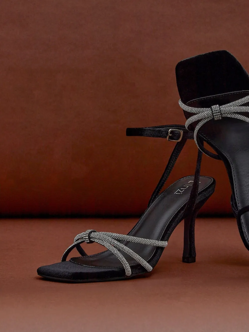 Glamour meets sophistication with our Polly Heels in black. Featuring a dazzling front diamante knot detail, wrap around adjustable ankle strap and stiletto heel. Made with a soft, cushioned insock to ensure all evening comfort. Heel height 8cm. Upper – Textile, Lining & Sock – Textile, Sole – Other Materials.