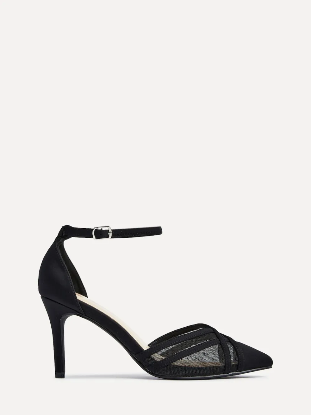 Our Black Siobhan Court Heels exudes elegance and chic sophistication, accentuated by a cross-over mesh detailing that creates a visually elongated effect for your foot. Perfect for stepping into any occasion with grace and style. Featuring a cushioned in-sock for all-evening comfort. Heel height 8.5cm. Upper – Textile, Lining & Sock – Textile, Sole – Other Materials.