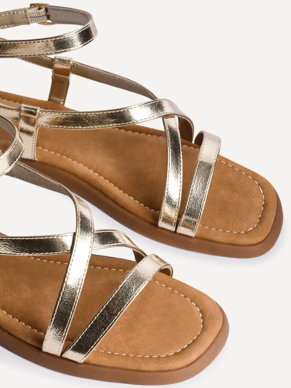 The Valor flat gold sandals boast a front strap paired with two crisscrossing straps that connect to a wrap-around ankle strap. Enhanced with a moulded footbed, these sandals offer comfort for daily wear. Upper – Other Materials, Lining & Sock – Other Materials, Sole – Other Materials.