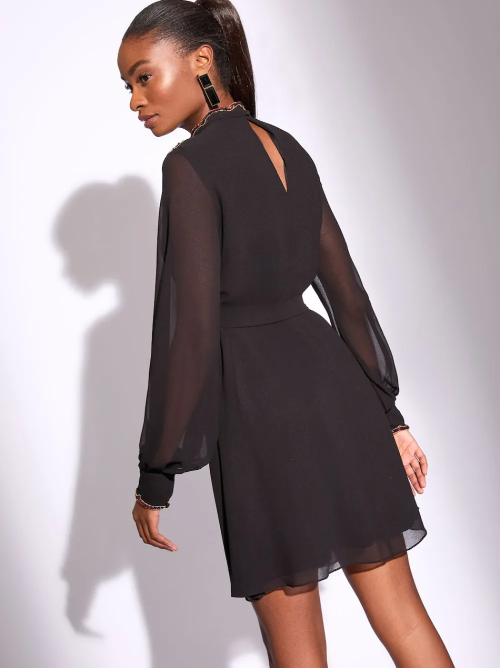 Make a sparkling statement this party season in this elegant mini shift dress. The flattering silhouette features a cinching belted tie waist and sheer, flowing long sleeves. The high neck is adorned with intricate, heavily embellished cut out artwork, making this dress a glamorous choice for any special occasion or Christmas party. Heavily embellished cut out artwork Sheer long sleeves Belted tie waist Flattering shift dress shape Occasionwear, party season Main 100% Polyester. Lining 100% Polyester.
