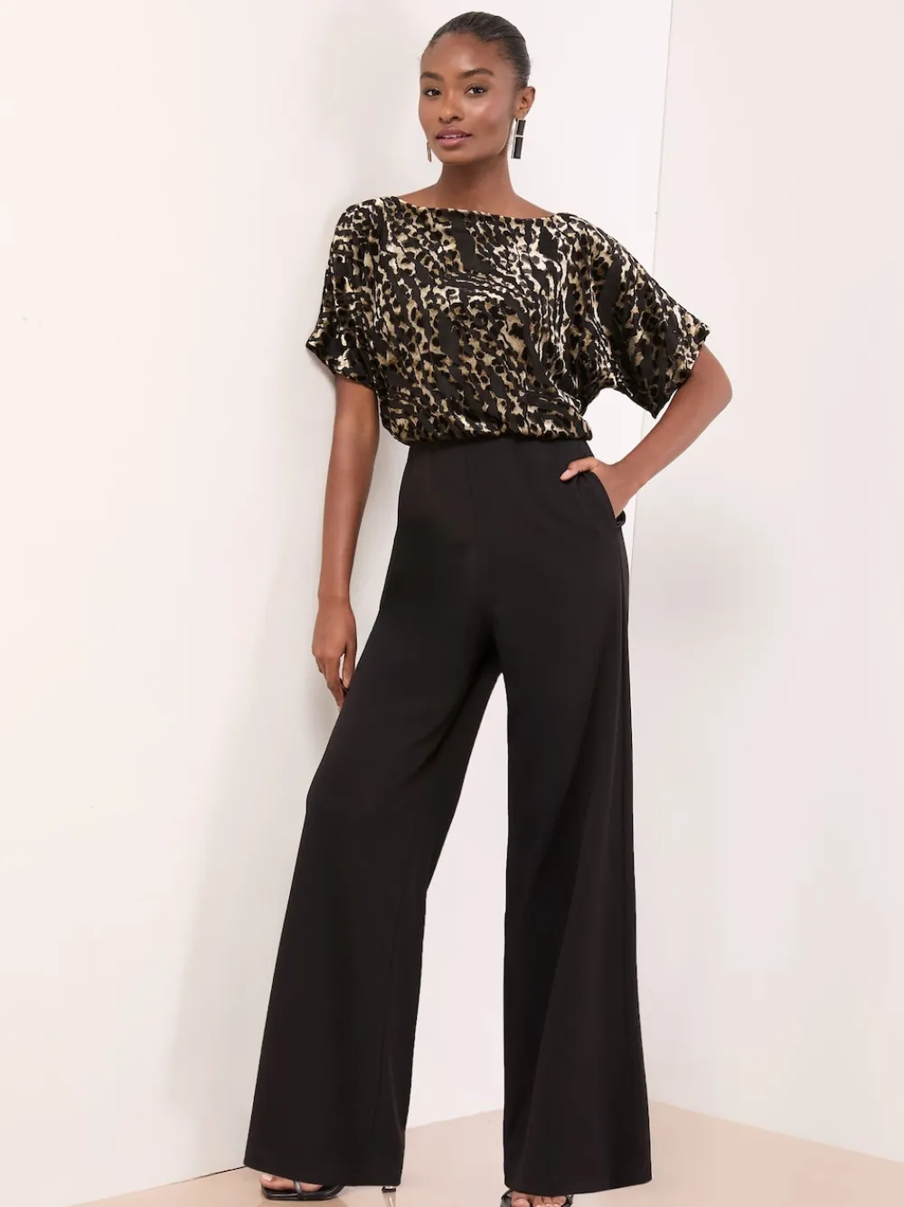 Command attention in this glamorous leopard print jumpsuit. The luxurious, fluid fabric and chic cowl neck create a stunning drape, while the wide-leg trouser cut elongates your silhouette. Define your waist with the included belt tie. Perfect for sophisticated evening wear and special occasions. Leopard print Cowl neck Belt tie Wide leg trouser Sleeveless design Main 43% Nylon, 43% Polyester, 14% Elastane. Bottom 97% Polyester, 3% Elastane. Lining 100% Polyester.
