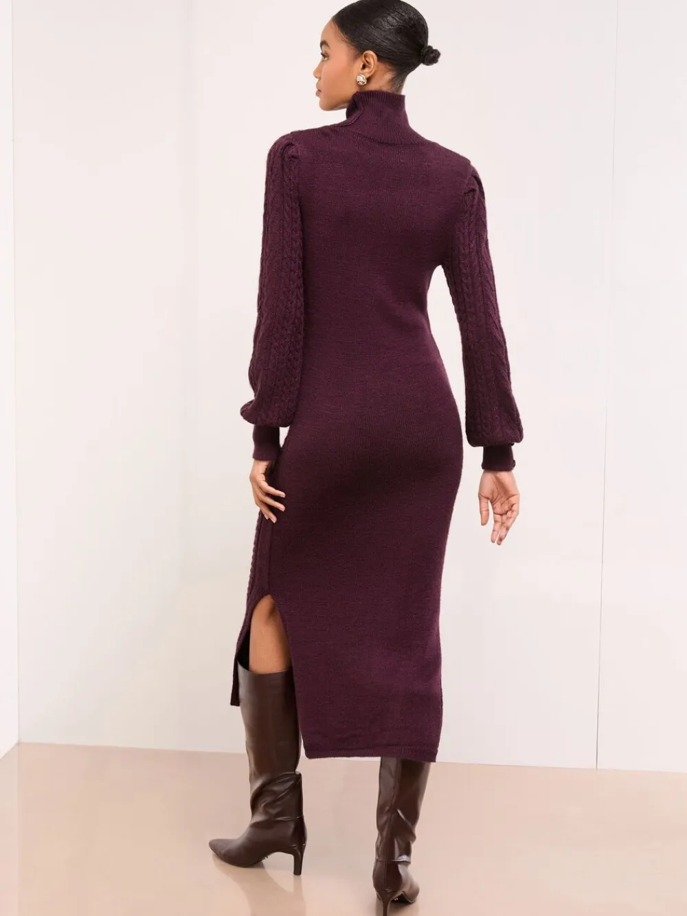 Be the best dressed this burgundy Autumn/Winter in our gorgeous roll neck midi dress. Crafted with a timeless cable knit design, this piece offers warmth and an effortlessly chic silhouette. Complete with stylish button cuff details, it is perfect when paired with boots for a glam, fashionable look. Roll neck Cable knit design Button cuff detail Midi dress Long sleeve 83% Acrylic, 9% Polyester, 8% Nylon.