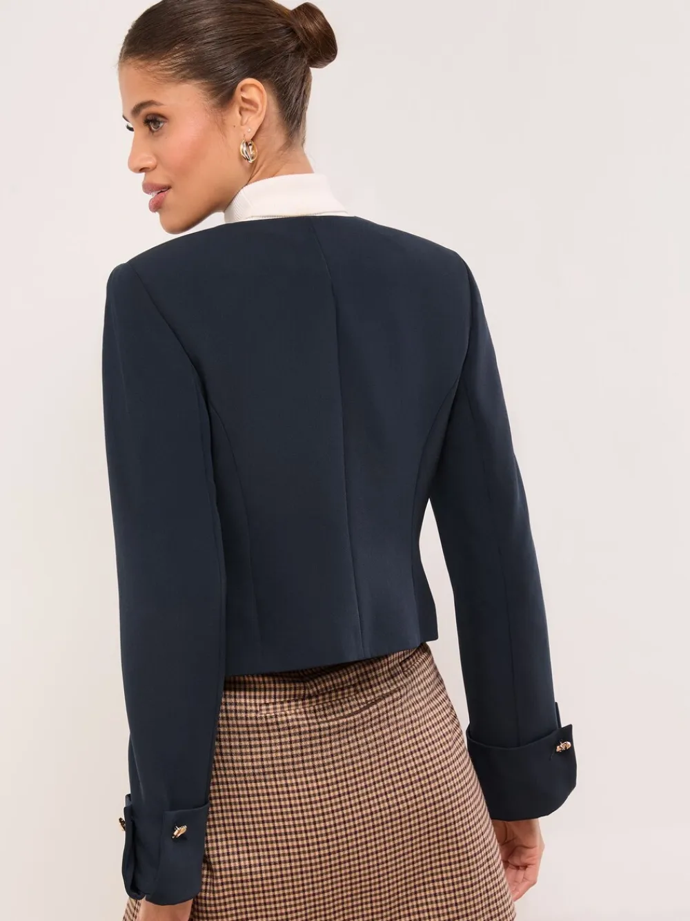 Channel effortless elegance with this chic navy cropped blazer. The tailored fit and collarless design offer a refined silhouette, beautifully enhanced by striking glam gold button trims on the front and stylish turn-up cuffs for an elevated look. Collarless style Gold button trims Cropped length Main 95% Polyester, 5% Elastane. Lining 100% Polyester.