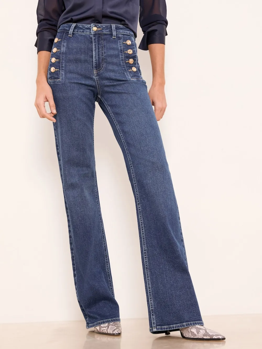 Embrace a chic 70s vibe with these dark wash flared jeans. Featuring striking sailor button pocket detailing, the stretch denim ensures a flattering fit and comfortable wear. Perfect for effortless casual style or elevating a weekend look. Petite fit Denim fabric Flared leg Sailor button detail Lipsy branded back patch 99% Cotton, 1% Elastane.