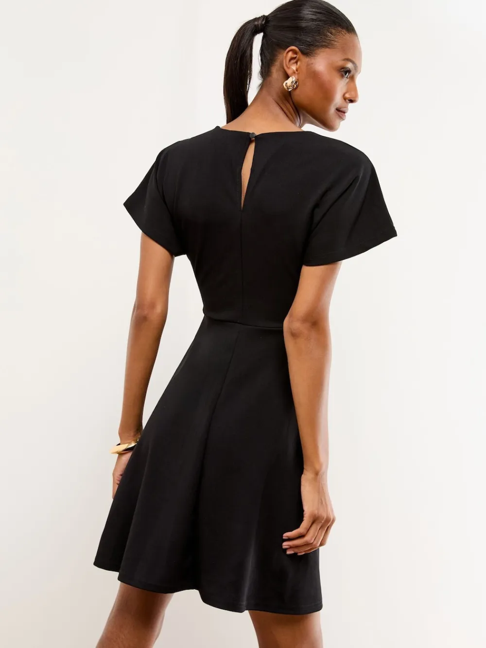 This versatile mini skater dress is perfect for smart occasions and the office. The flattering fit-and-flare skirt and crew neck are elevated by the contemporary hardware detailing at the waist, which cinches the silhouette beautifully. This dress is ideal for formal workwear or sophisticated day-to-night events. Crew neck Hardware detail at waist Skater mini skirt Short cap sleeves Dress style Main 97% Polyester, 3% Elastane. Lining 100% Polyester.