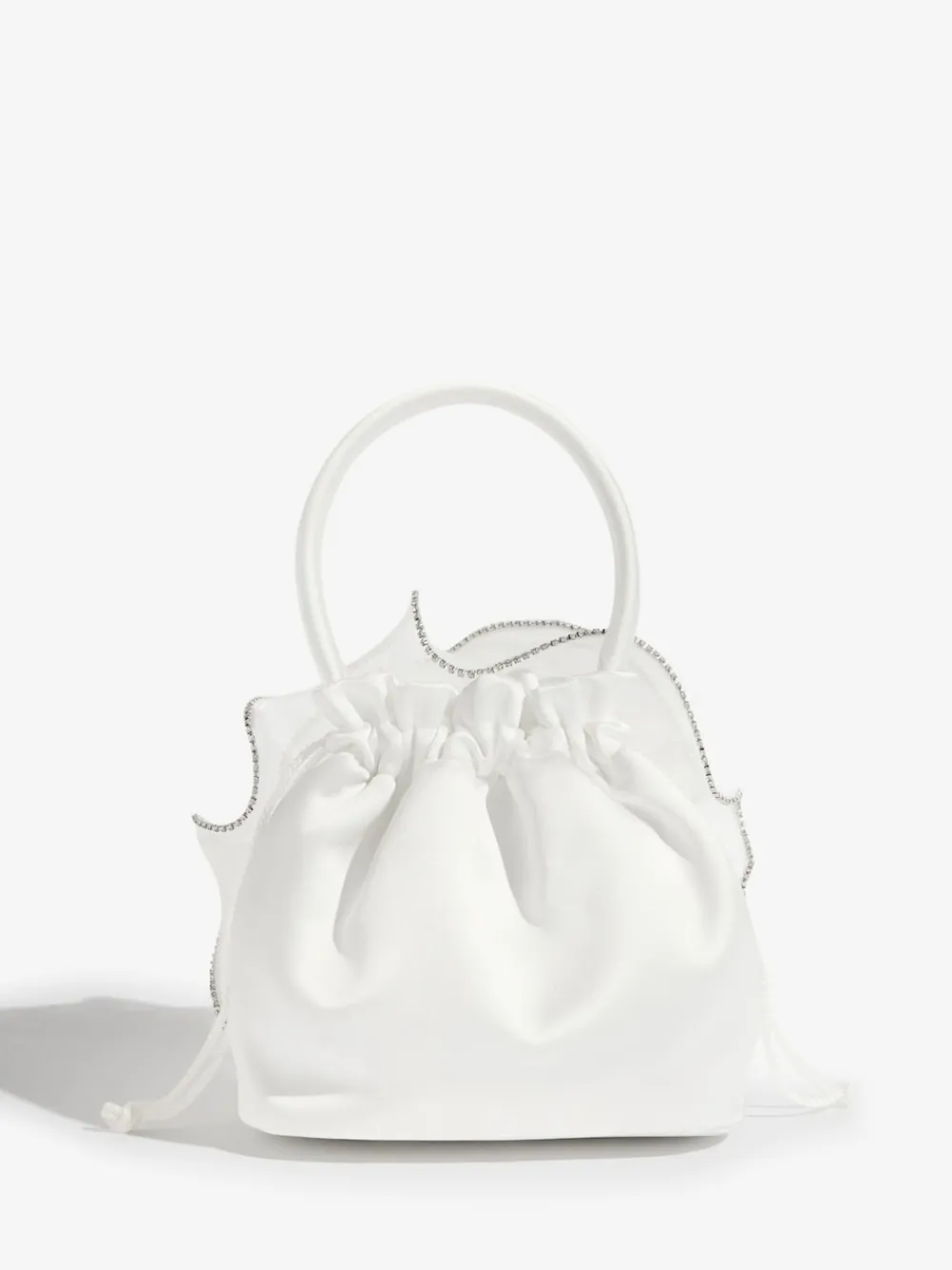 Make a stunning statement on your special day with this Lipsy Ivory Bridal Embellished Rose Top Handle Bag. Crafted from elegant satin-like fabric, this drawstring bucket bag is shaped like a beautiful rose with delicate diamante embellishment. Perfect for weddings or bachelorette parties, it features a fixed top handle and a hidden inside chain strap for versatility. Elegant satin-like fabric Unique rose-shaped design Features diamante embellishment Drawstring bucket style Inside chain strap included Best for bridal and special occasions Height 17cm Width 17.5cm Depth 11cm Main 100% Polyester. Lining 100% Polyester. Trim 100% Polyester.