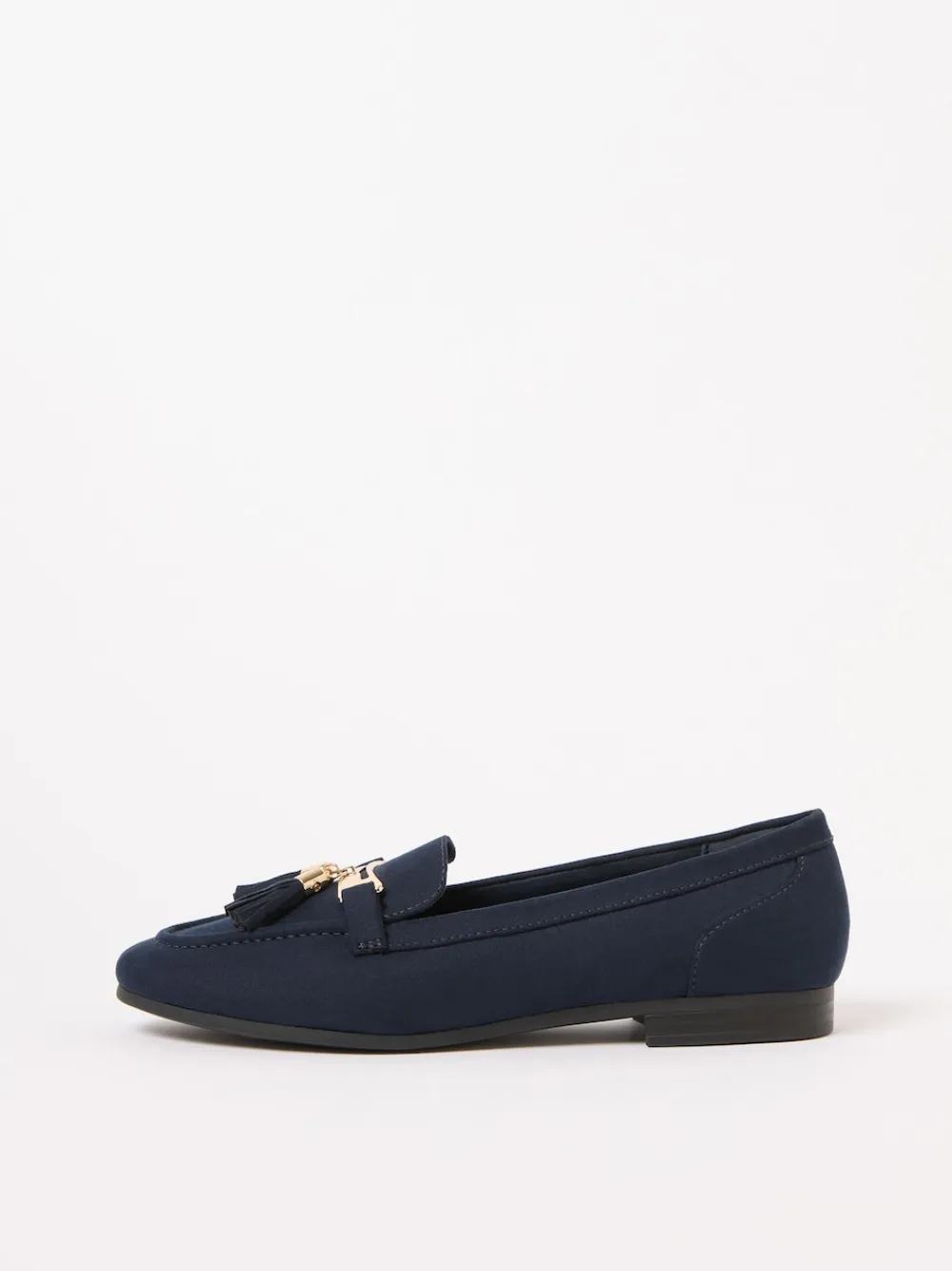 Elevate your everyday wardrobe with these chic navy loafers, perfect for smart-casual styling or effortless daywear. The faux suede finish and almond toe combine timeless elegance, while the tassel detail with gold metallic hardware adds a polished, trendy accent Faux suede Almond shaped toe Gold metallic hardware with tassel detail Slip on loafer design Upper – Textile, Lining & Sock – Textile, Other Materials, Sole – Other Materials.