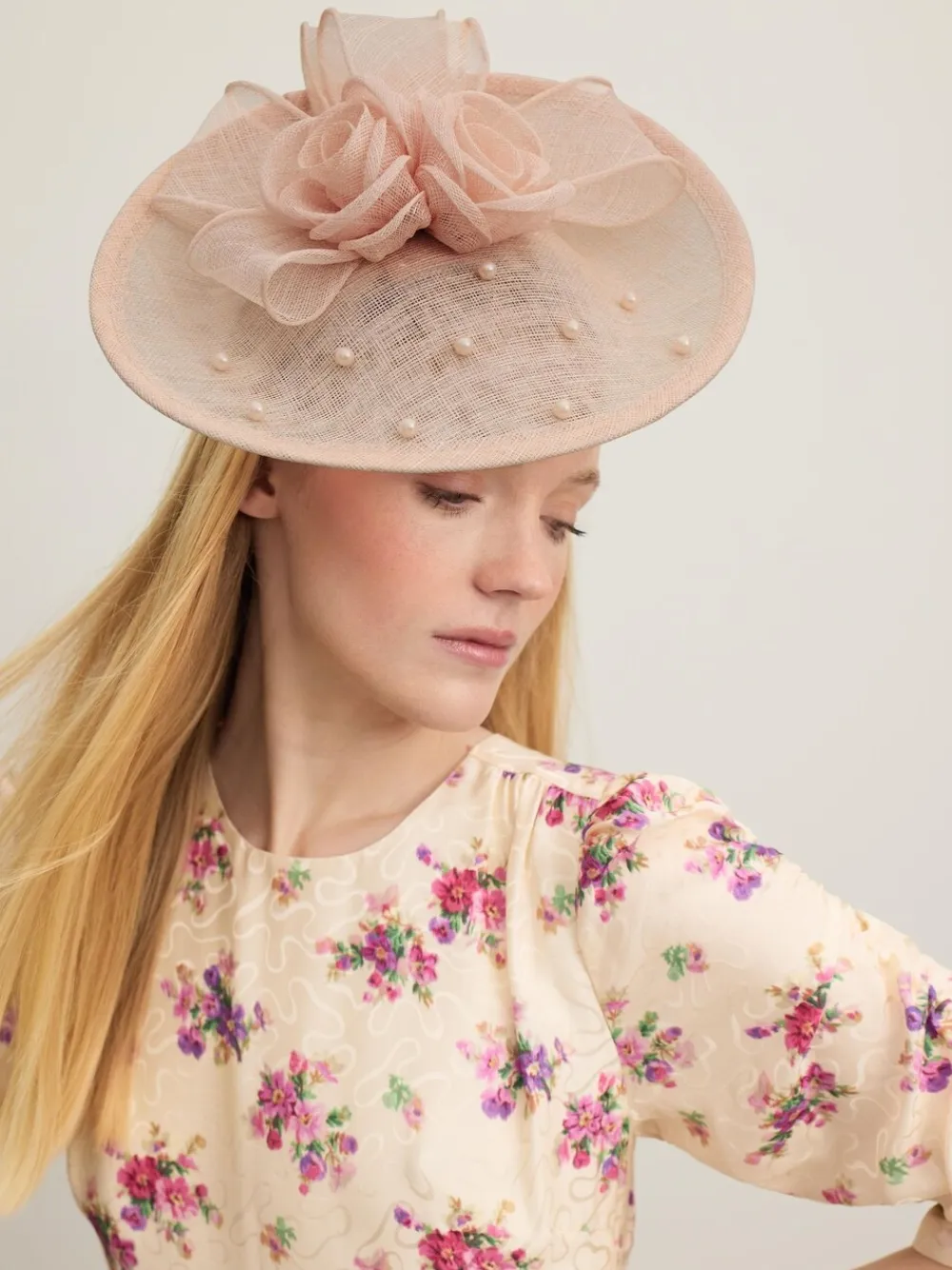 The Ayla fascinator is crafted from pretty pink mesh embellished with pink pearls. It’s an easy-to-wear hairband style with a wide brim and matching mesh corsage detail. 100% Abaca.