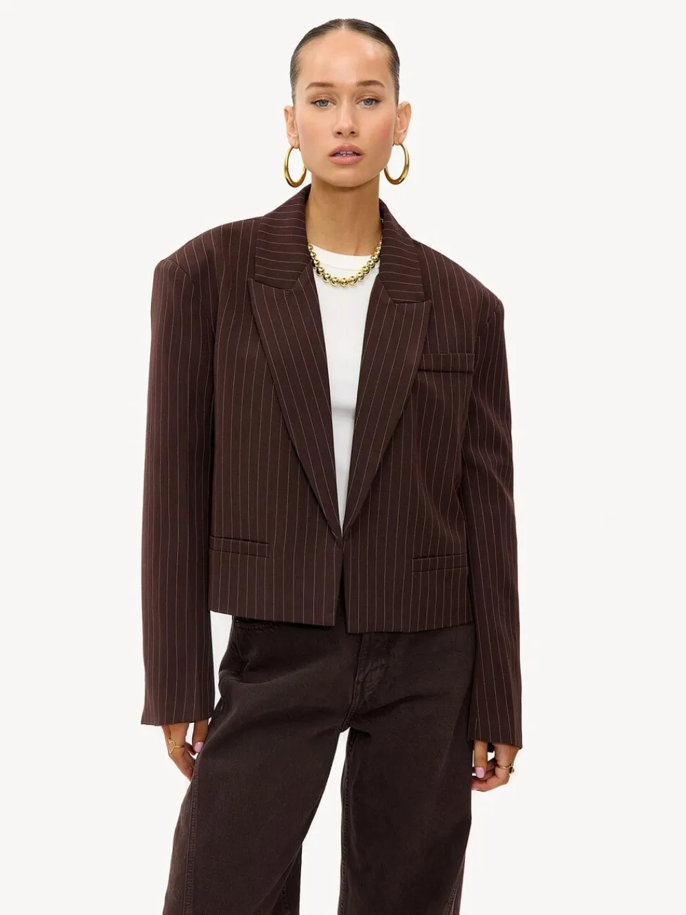 This brown pinstripe blazer has a classic tailored fit with statement oversized shoulders. The chocolate color with subtle white stripes gives this design a sophisticated twist. The blazer features notched lapels and a single-button closure for a clean look. Style this blazer with matching wide-leg trousers for a powerful office look. 95% Polyester, 5% Elastane.
