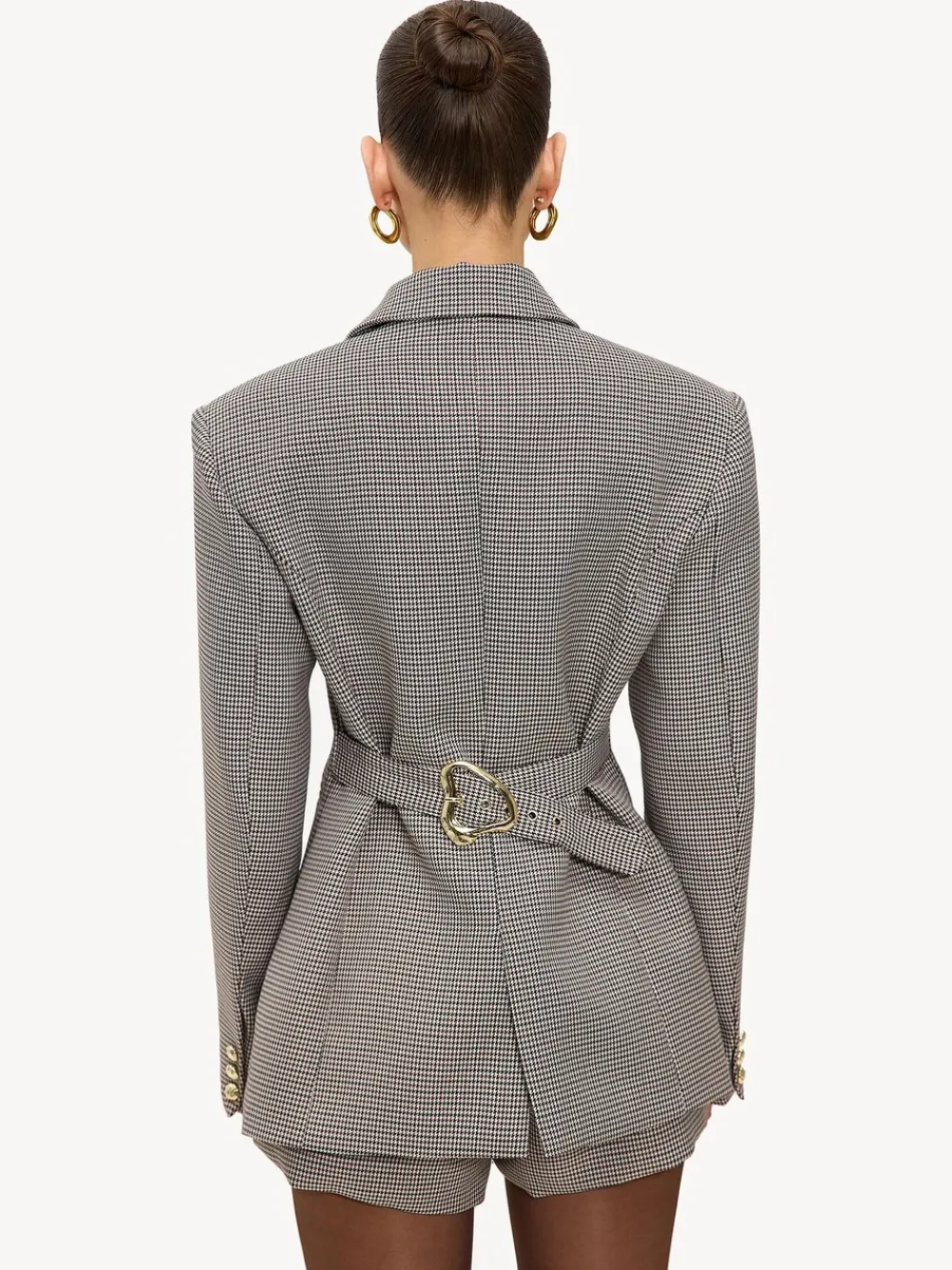 This tailored blazer features a classic houndstooth pattern in neutral tones for a timeless look. The tailored fit with gold statement buttons and sharp lapels creates a chic professional appearance. The long blazer with subtle split detail gives a modern twist to the classic design. Style this blazer with the matching shorts for a sophisticated co-ord look. 97% Polyester, 3% Elastane.