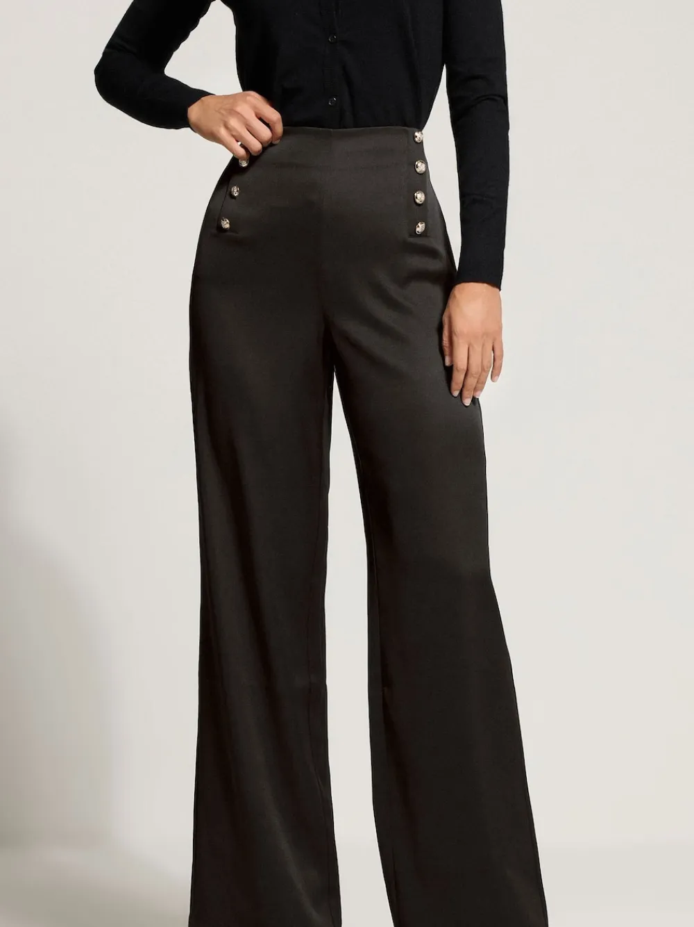 Fit & Fashion Notes: Revel in a new style with these military style trousers. Made from a soft jersey fabric, they feature gold tone button details, tailored design, zip fastening and wide leg. It is complete in a military style. Pair with your choice of blouse and flats for endless office wear this upcoming season! Features: Military style Gold tone button details Tailored design Zip fastening Wide leg Made from a soft jersey fabric 95% Polyester 5% Elastane Inside seam measures: 34- 36 Machine washable Model is 5’10.5/179cm and size UK 10/EU 38 Machine washable. 95% Polyester, 5% Elastane.