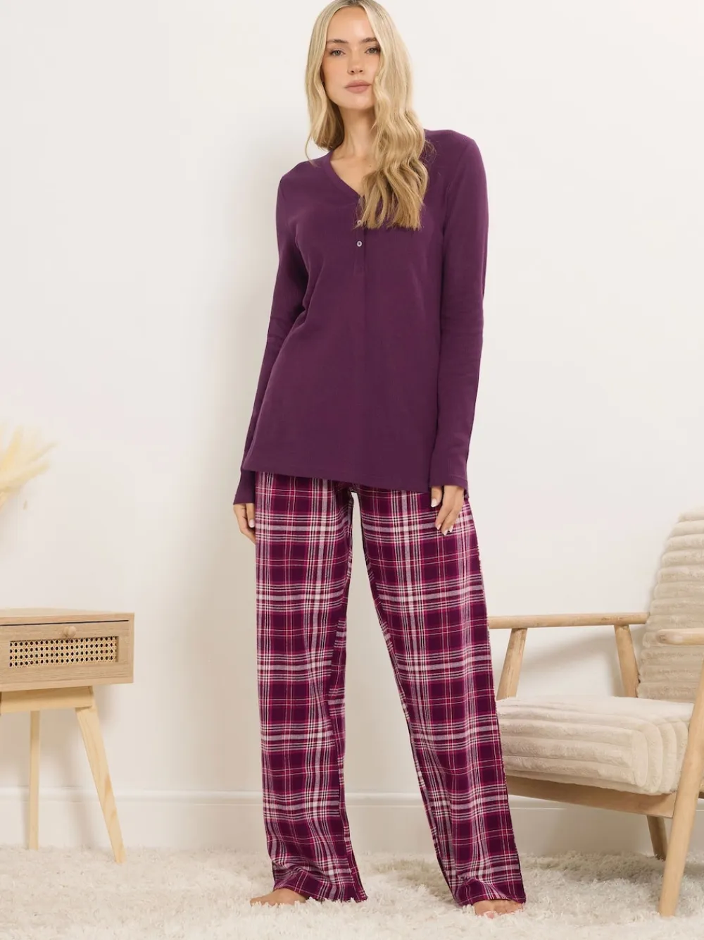 Fit & Fashion Notes: Combine both comfort and style to your sleepwear with these woven check pyjama bottoms. Made from a soft cotton fabric, they feature an elasticated waistband with a drawstring tie and complete in a wide leg fit. Mix and match with our selection of waffle pyjama tops for a subtle festive feel! Features: Woven check Wide leg fit Elasticated waistband Drawstring tie Side pockets Made from a soft cotton fabric 100% cotton Inside seam measures: 33” Machine washable Model is 5ft 11” / 180 cm and size UK 10/EU 38. Machine washable. 100% Cotton.