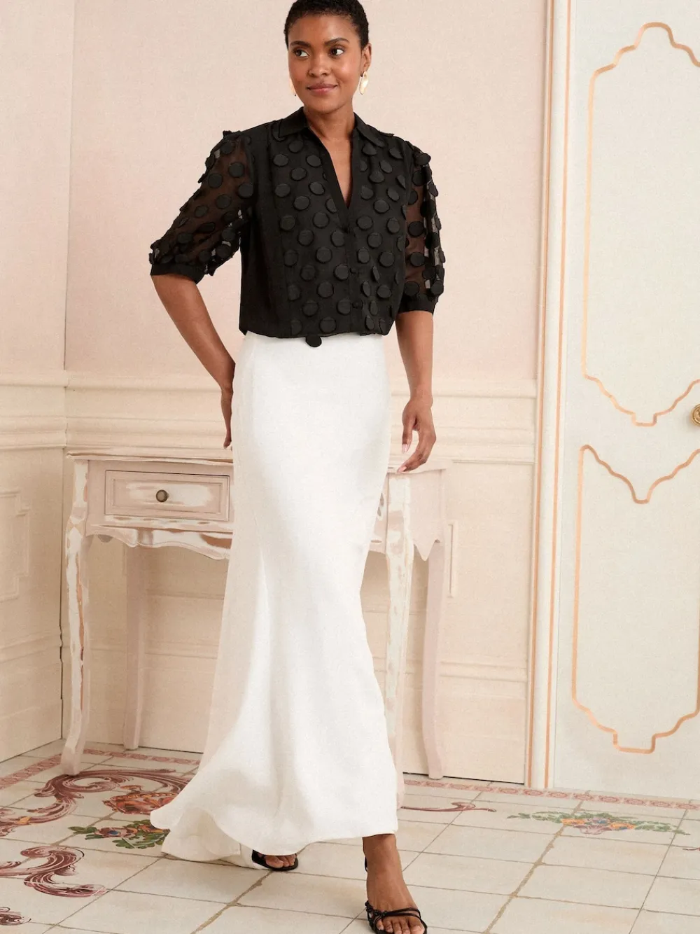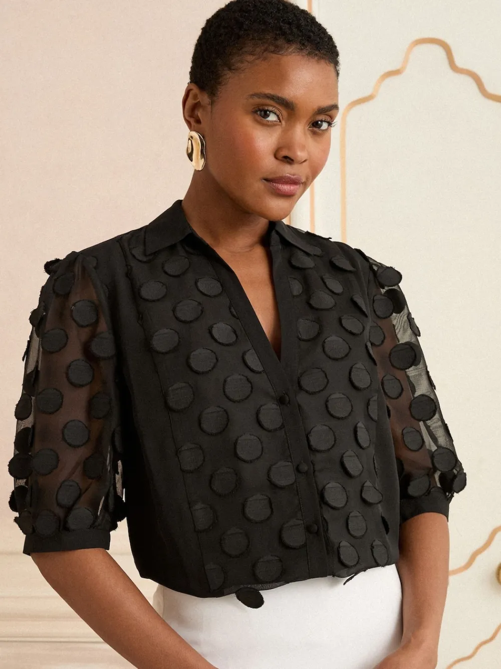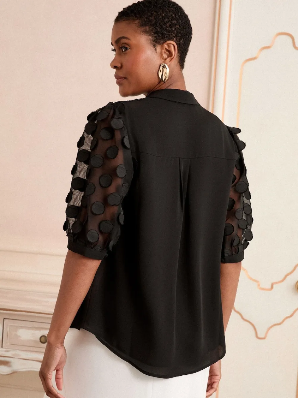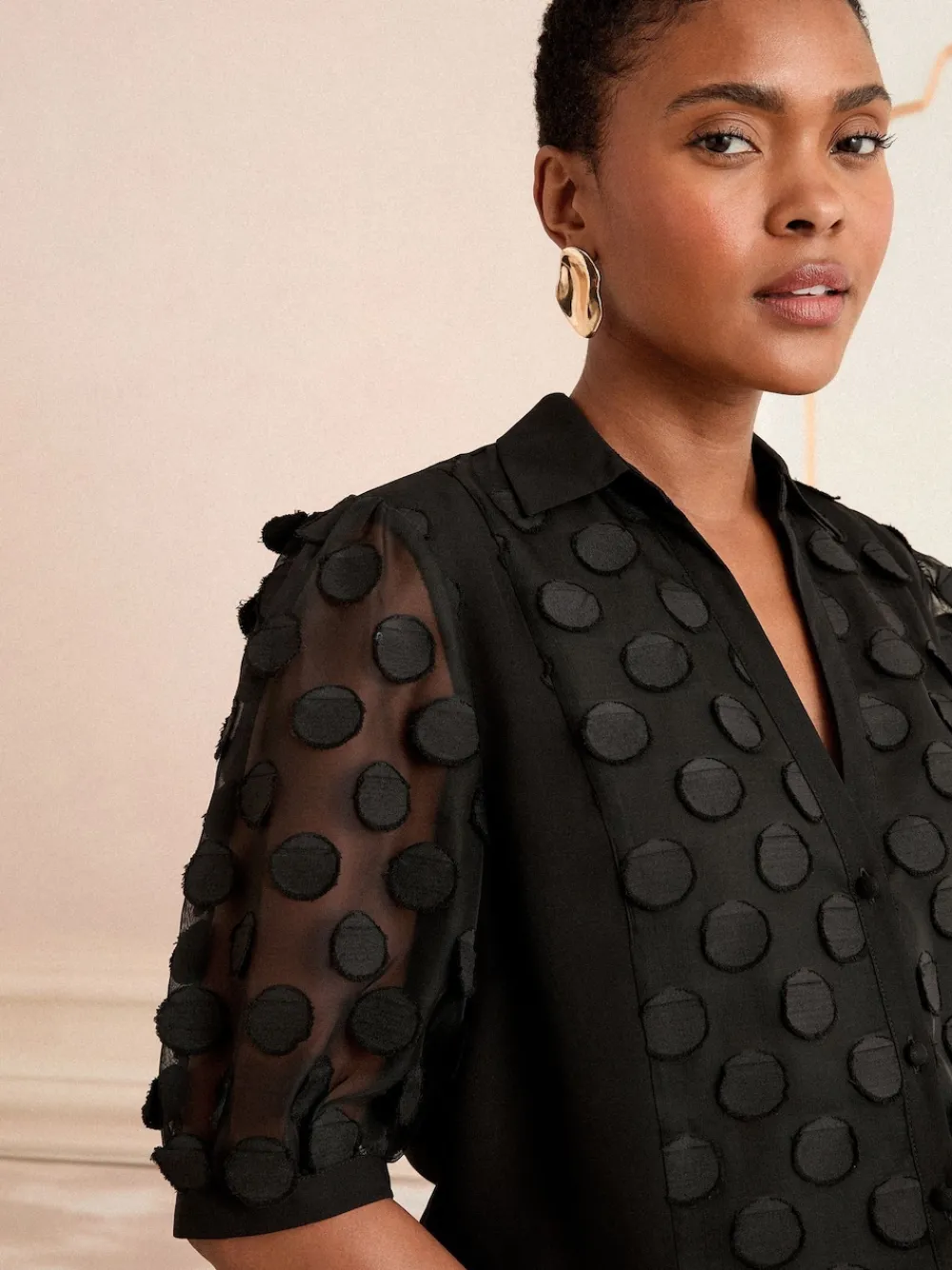 Elevate any basic outfit with this statement shirt, featuring our iconic spot texture on a black sheer base. The chic collar and button-through design make it the perfect piece to transition seamlessly from desk to dinner. Iconic spot texture Collar and button-through Three-quarter length sleeves Sheer fabrication Main 100% Polyester. Lining 100% Polyester. Panel 100% Polyester.