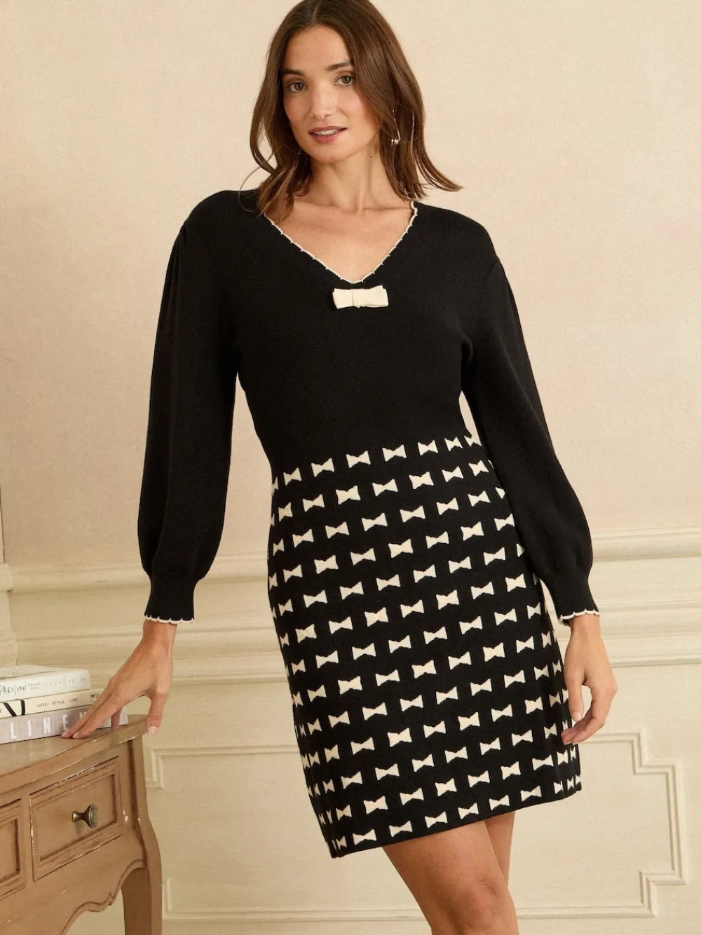 Love & Roses Black Bow Print V-Neck Knitted Mini Dress Hot