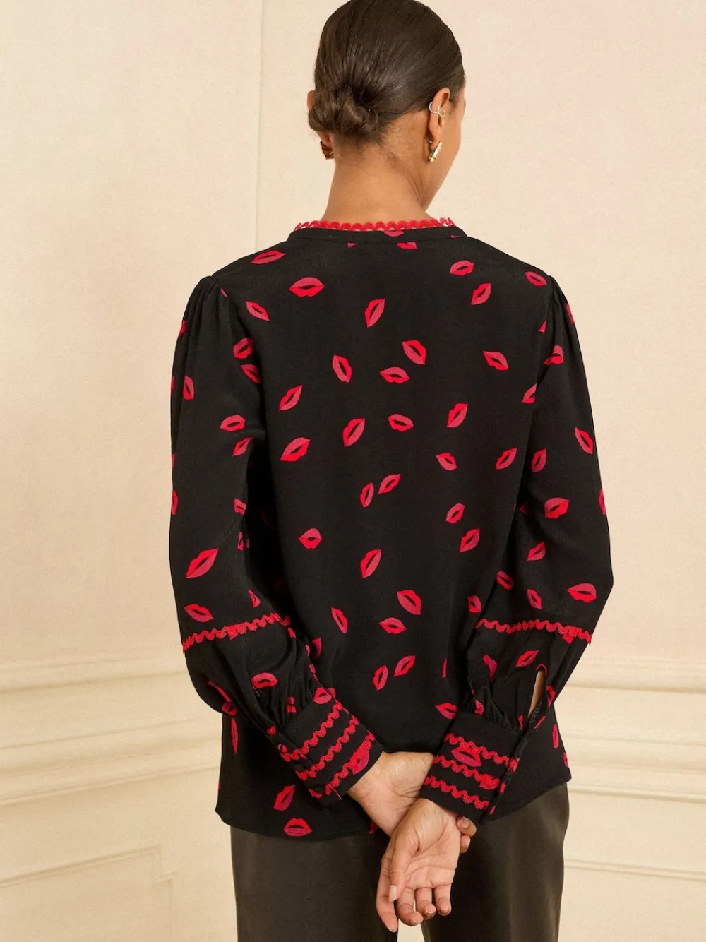 Pucker up for playful sophistication with the Love & Roses Black Lips Print Notch Neck Long Sleeve Blouse. This striking top features a fun, scattered red lips print against a classic black background, making a bold yet chic statement. The design includes a flattering notch neck and is beautifully detailed with contrasting red piping and subtle embroidery that follows the placket and trims the collar. Long sleeves finish in deep, smocked and embroidered cuffs, adding structure and texture. Crafted from a soft, fluid fabric, this blouse pairs effortlessly with sleek leather trousers or tailored skirts for a captivating look. Notch neck Lips print Red piping 53% LENZING™ ECOVERO™ Viscose, 47% Viscose.