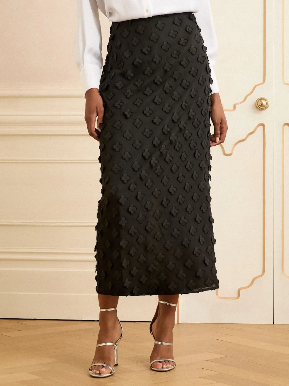 Beautiful 3D floral fully lined midi skirt. Avaliable in different colours. Main 100% Polyester. Lining 100% Polyester.