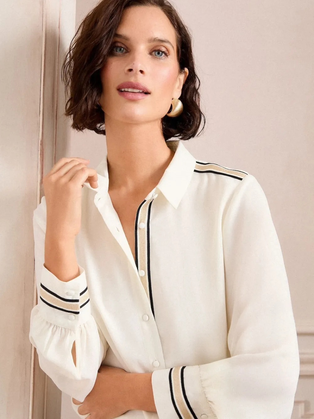 Love & Roses Button Through Long Sleeve Shirt White Ecru Metallic Sale