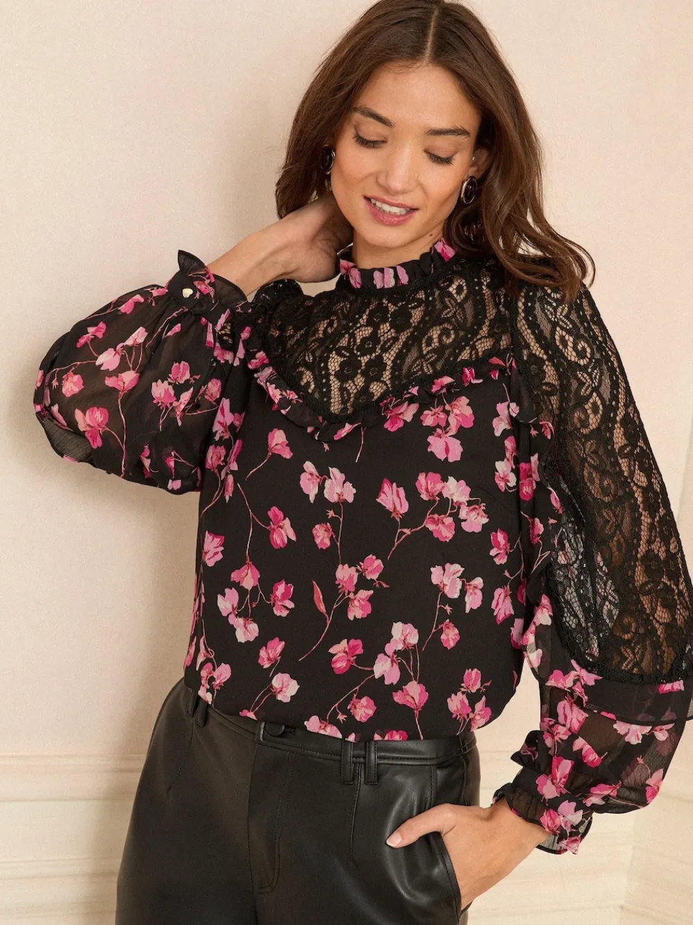 Elevate your look instantly with this romantic blouse. The striking lace yoke and sleeves are beautifully detailed with delicate ruffles, while the long blouson sleeves offer a sophisticated, textured silhouette perfect for evening or smart-casual wear. Lace yoke and sleeves Ruffle detail Crew neck Main 100% Polyester. Lining 100% Polyester. Lace 46% Nylon, 32% Cotton, 14% Viscose, 8% Lyocell.
