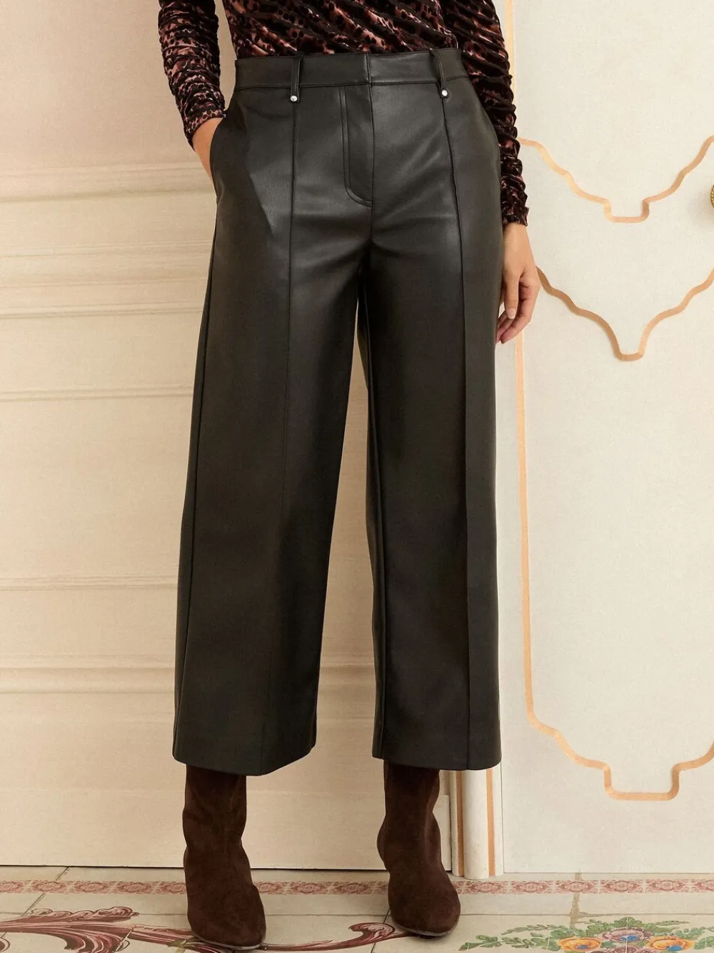 Create a contemporary silhouette with these chic faux leather trousers. The flattering wide-leg crop design is tailored with sharp pintuck detailing, offering a sophisticated and on-trend look perfect for elevated workwear or smart casual outings. Faux leather fabric Wide-leg crop Pintuck detail 100% Polyester with PU coating.