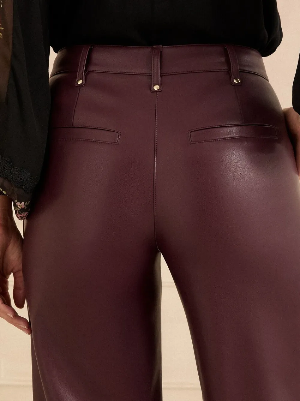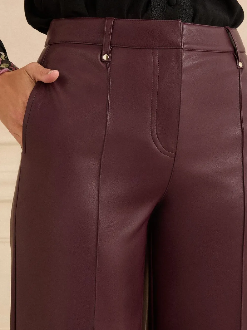 Create a contemporary silhouette with these chic faux leather trousers. The flattering wide-leg crop design is tailored with sharp pintuck detailing, offering a sophisticated and on-trend look perfect for elevated workwear or smart casual outings. Faux leather fabric Wide-leg crop Pintuck detail 100% Polyester with PU coating.