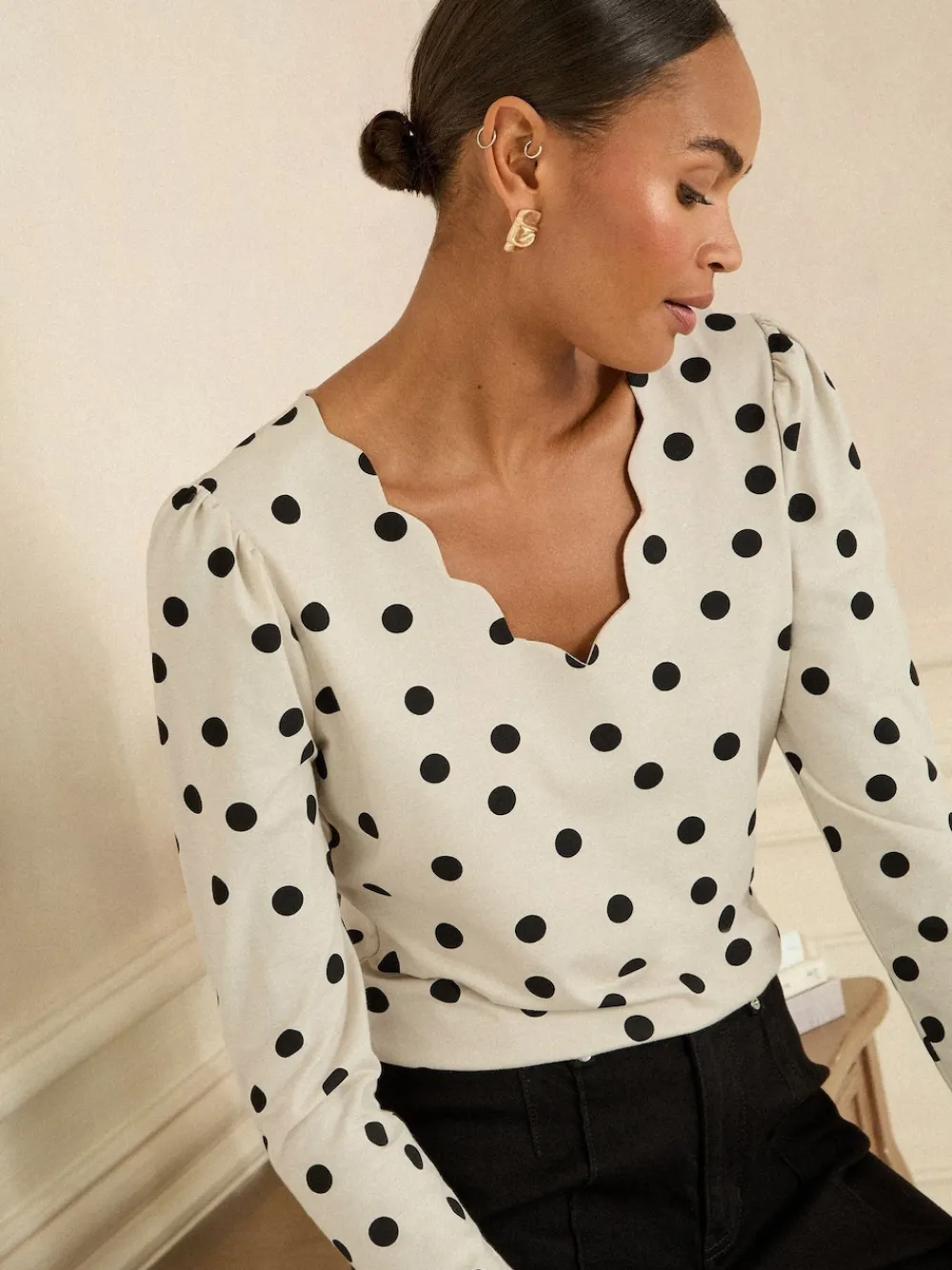 Love & Roses Ivory and Black Spot Print Scallop V-Neck Long Sleeve Jersey Top Outlet
