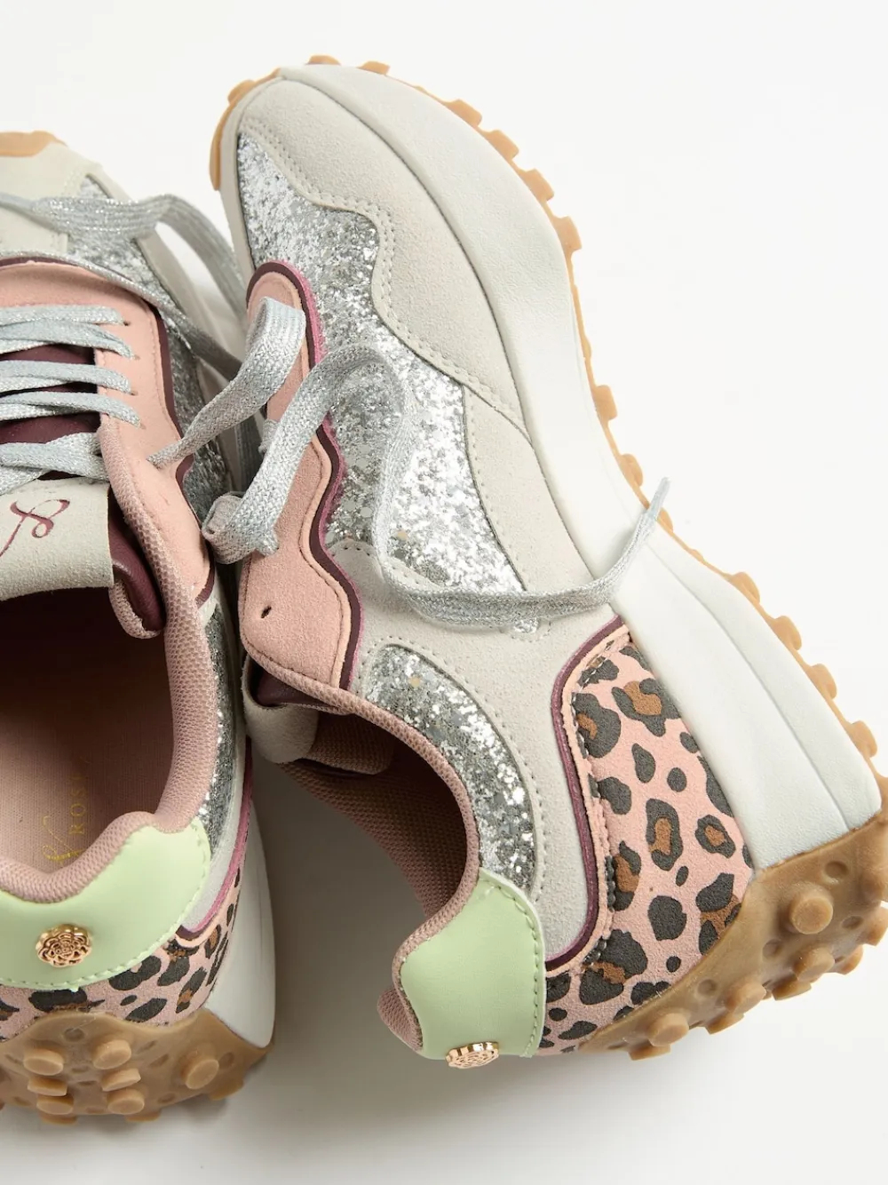 Step up your casual game with a dazzling dose of retro flair in the Love & Roses Silver Glitter Mix Material Retro Comfort Jogger Trainers. These trainers are designed to add instant sparkle and glam to any outfit, featuring a dynamic, multicoloured, multi-textured design. Key accents include striking silver glitter panels, playful leopard print details on the heel and fashionable colourblocked sections in soft pink and mint green. Completing the look are contrasting silver metallic laces and a textured gum outsole, ensuring both exceptional grip and an authentic, comfortable retro silhouette. Multicoloured design Leopard print and glitter accents Textured gum outsole Upper – Other Materials, Lining & Sock – Textile, Sole – Other Materials.