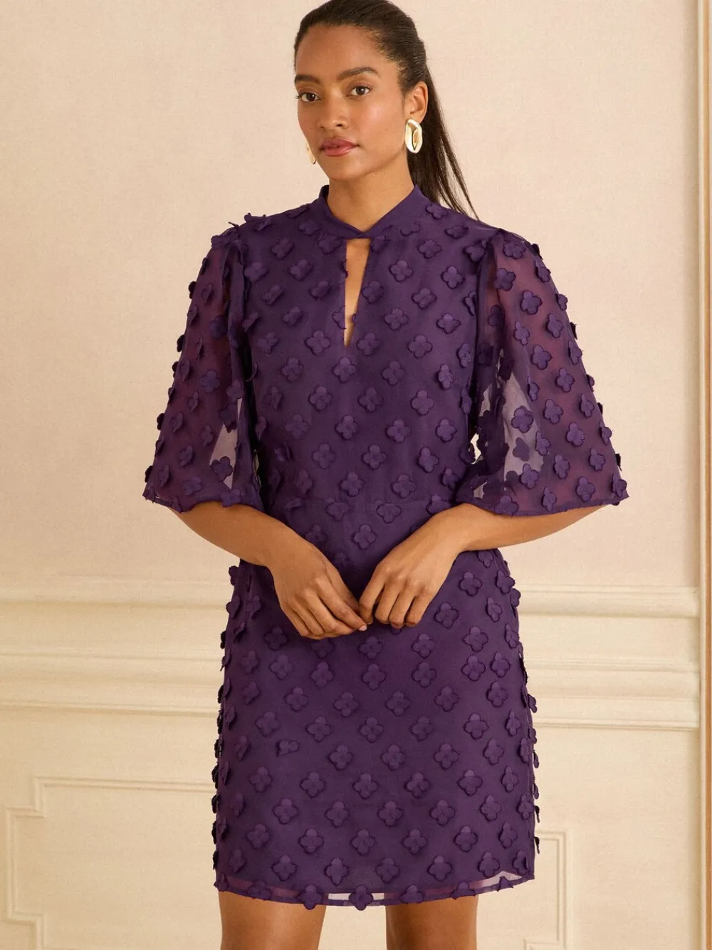 Step out in vibrant texture with the Love & Roses Purple 3D Floral Angel Sleeve Mini Dress. This captivating dress is crafted from a beautiful, interesting sheer fabric that features an all-over dimensional 3D floral appliqué for a stunning depth of texture. The dress has a flattering mini-length silhouette, a chic high neckline with a small keyhole detail and elegant sheer angel sleeves that offer graceful movement. In a rich shade of purple, this dress is perfect for cocktail parties or special occasions where you want an eye-catching and feminine look. 3D flower detail Angel sleeves Mini length Main 100% Polyester. Lining 100% Polyester.