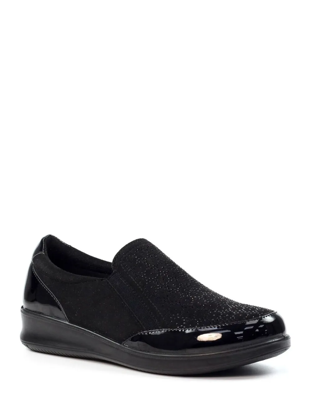 Designed with comfort in mind, our Hattie wedge shoe offers unparalleled support and comfort. Crafted from premium materials, this shoe ensures durability and ease. Featuring a sturdy sole with a low wedge heel and elasticated side panels for effortless wear. Adorned with a sparkling diamante-encrusted upper and faux patent leather panels for a touch of elegance. Heel height 2.5cm. Main – 100% Synthetic rubber. Lining – 100% Textile.
