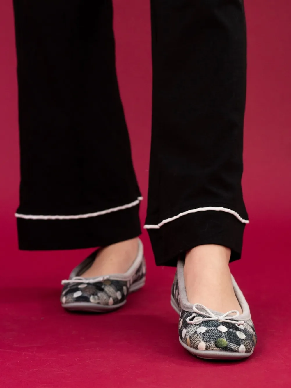 The Magic Grey Pump Slipper is a cosy and stylish addition to your loungewear collection. The knitted print textile upper features a playful pom-pom effect and bow, while the super soft fleece lining keeps your feet warm and comfortable. The slip-on pump design and padded insole make for easy wear, and the rubber sole ensures durability for indoor use. Upper – 100% Textile, Lining. and Sock – 100% Textile. Sole – 100% Rubber.