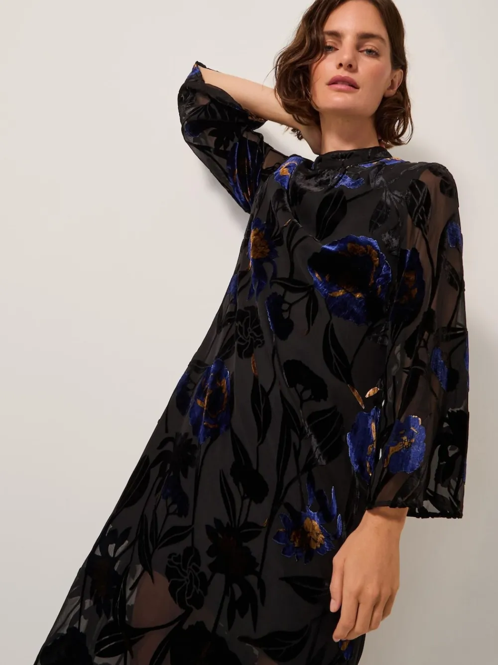 After dark glamour. Date night or dinner party, this dress is sure to turn heads. Showcasing luxuriously soft velvet florals winding from the long sleeves to the calf-skimming hem, it s designed with a mini slip underneath and side slits to finish. Machine washable. Main 100% Nylon. Lining 100% Polyester.