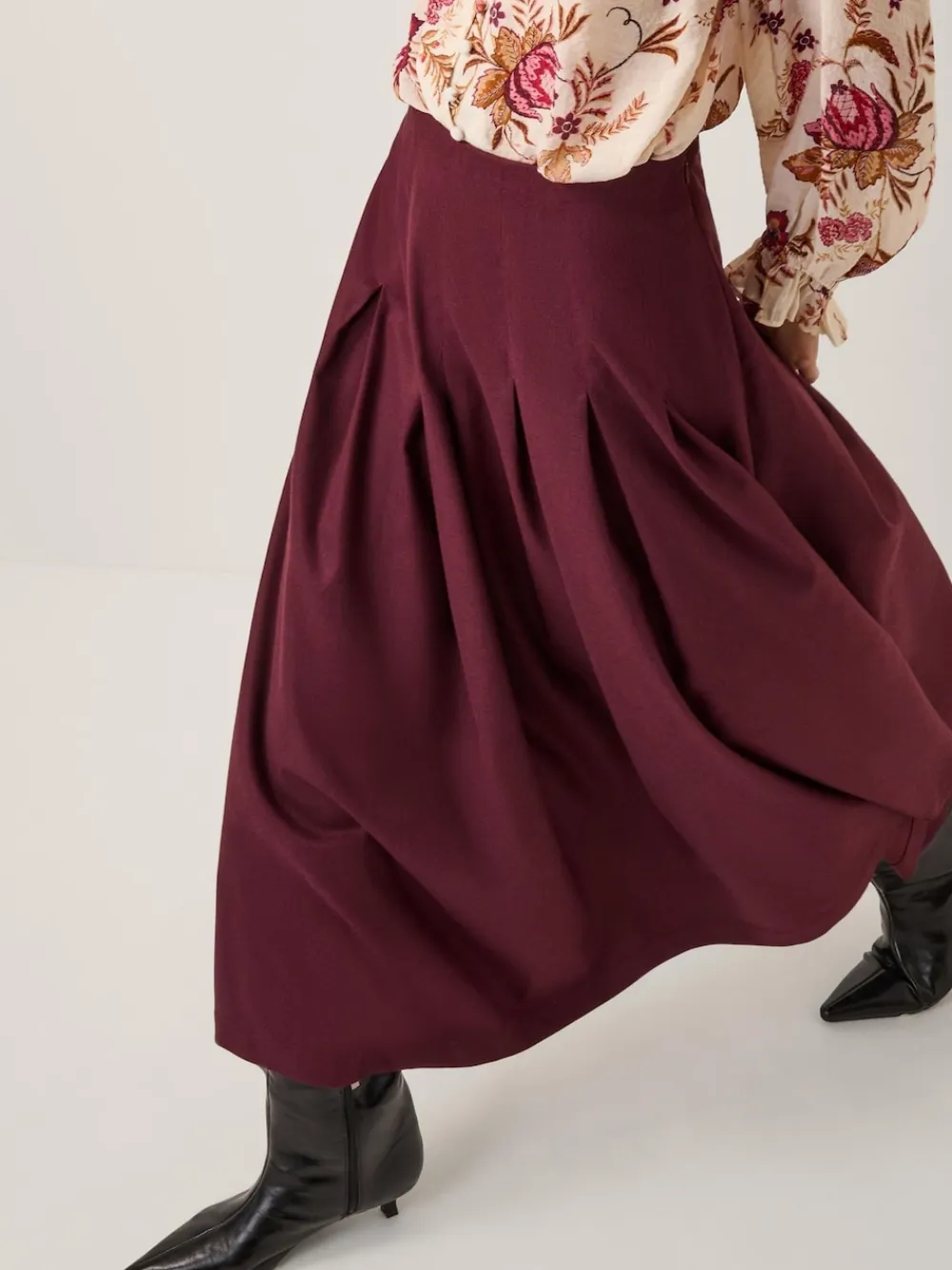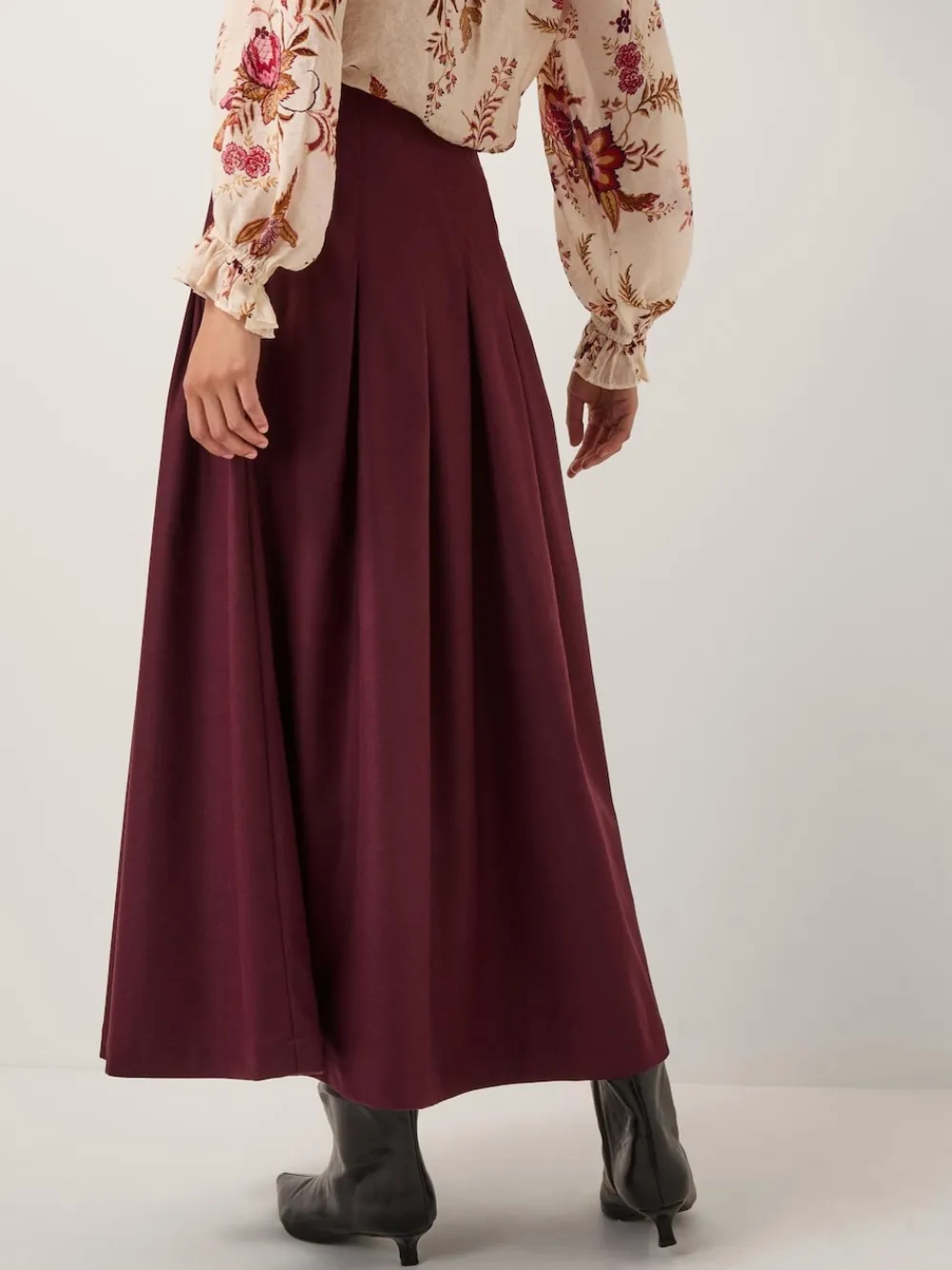 Anyone fancy a merlot? Soaked in a burgundy hue and brimming with sophistication, this skirt works for the office and fancy date nights. Sitting high on the waist, it’s tailored with inverted pleats that flare out to the midi length hem. Machine washable. 65% Polyester, 32% Viscose, 3% Elastane.