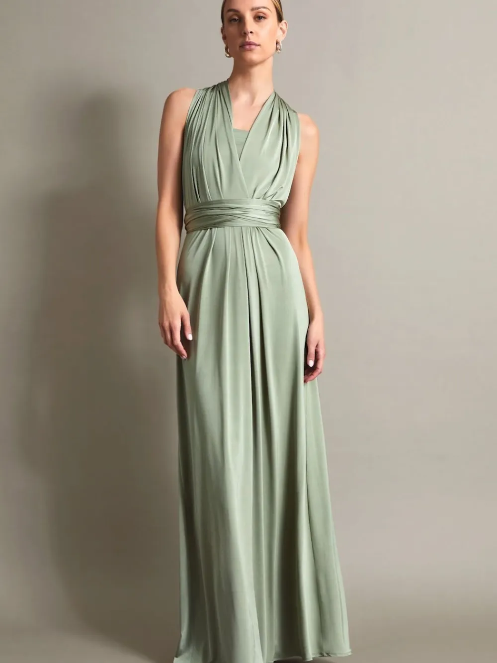One dress, multiple styles. This smooth, silky-feel bottle green multiway dress can be tied and twisted in 15 beautiful styles, offering a different look to suit every member of the bridal party. Two long straps and a matching bandeau build the bodice, and then it’s up to you whether you wear it halterneck, twisted or backless. Finished with an easy-to-alter hemline and clear instructions for all the ways to tie it. Machine washable. 97% Polyester, 3% Elastane.
