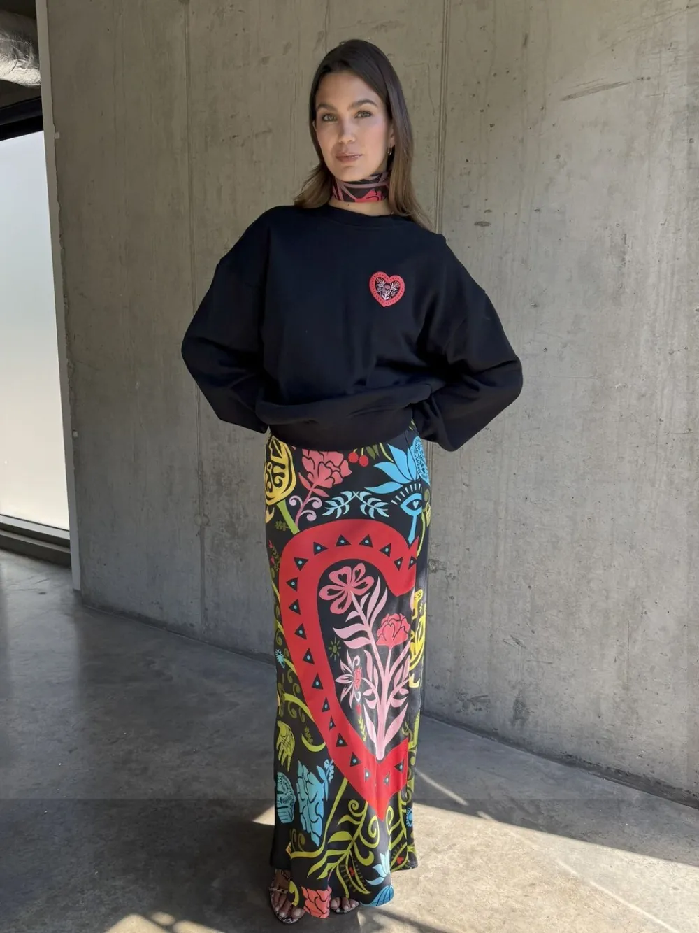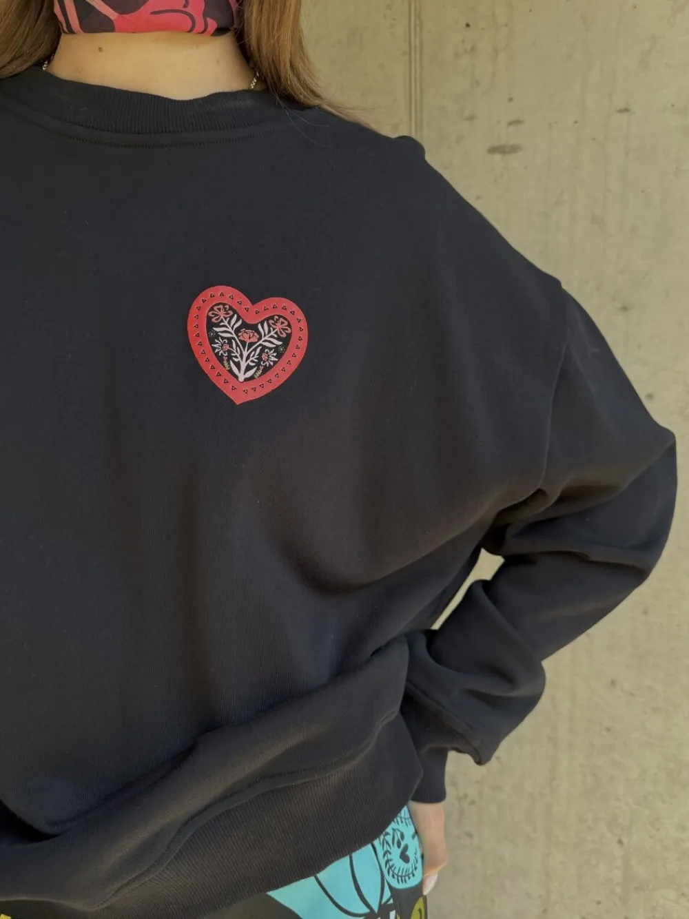 Make a bold statement with this comfortable black sweatshirt, featuring an intricate and vibrant folk-art-inspired graphic on the back. Detailed with a colourful array of heart and flower motifs and the iconic Never Fully Dressed eye. Machine washable. 96% Cotton, 4% Elastane.