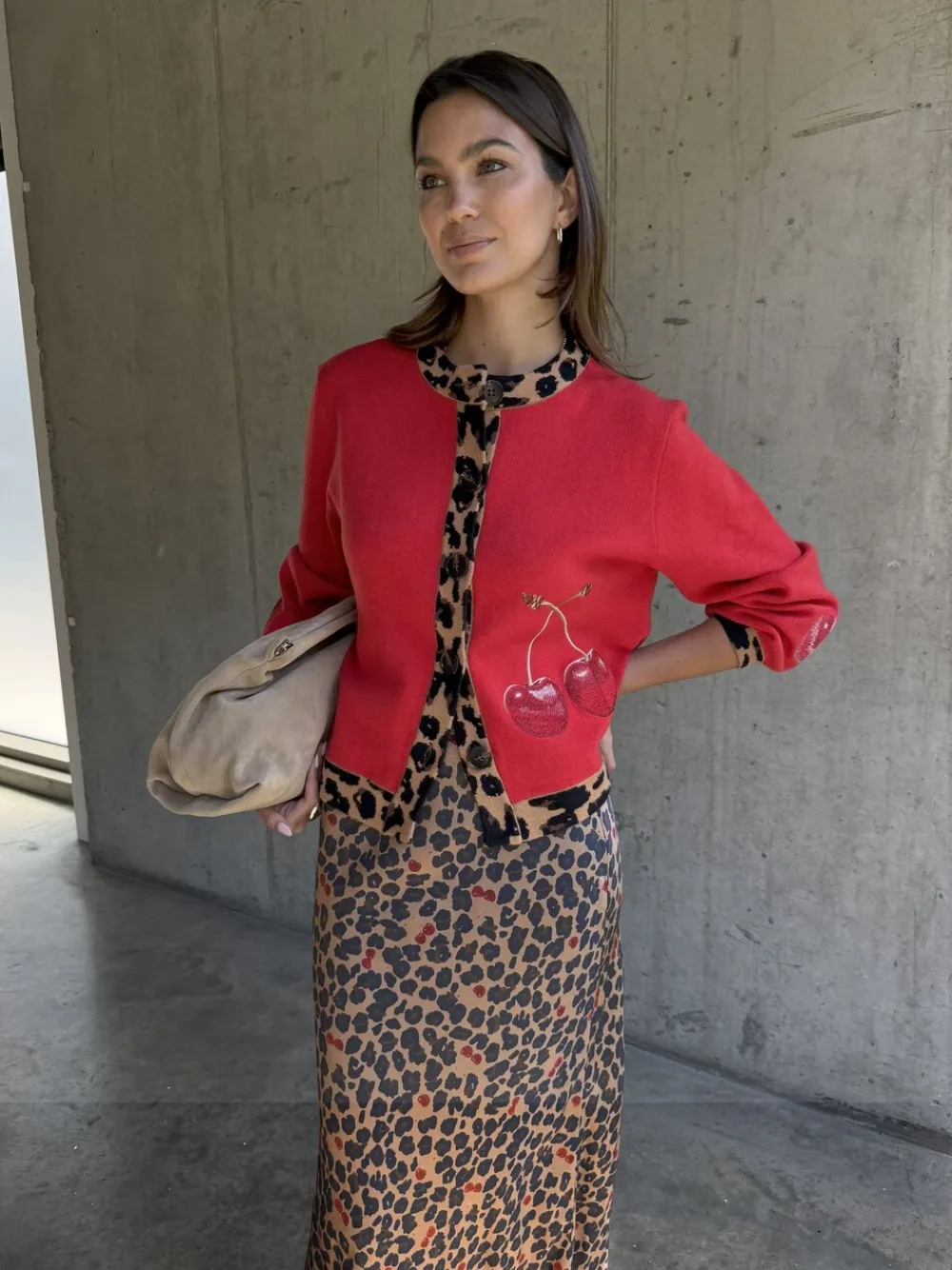Our classic Dorris silhouette in our bestselling leopard print, the perfect transitional piece to take you into the colder months! We’ve elevated even further by adding small cherries into the print that add an extra touch of NFD flair. The relaxed silhouette allows you to style with ease, whether it’s with a casual tee or paired with the matching cardigan and heels for the change of season. 50% Lenzing™ Ecovera™ Viscose 50% Viscose Filament. Machine washable. 100% Viscose.