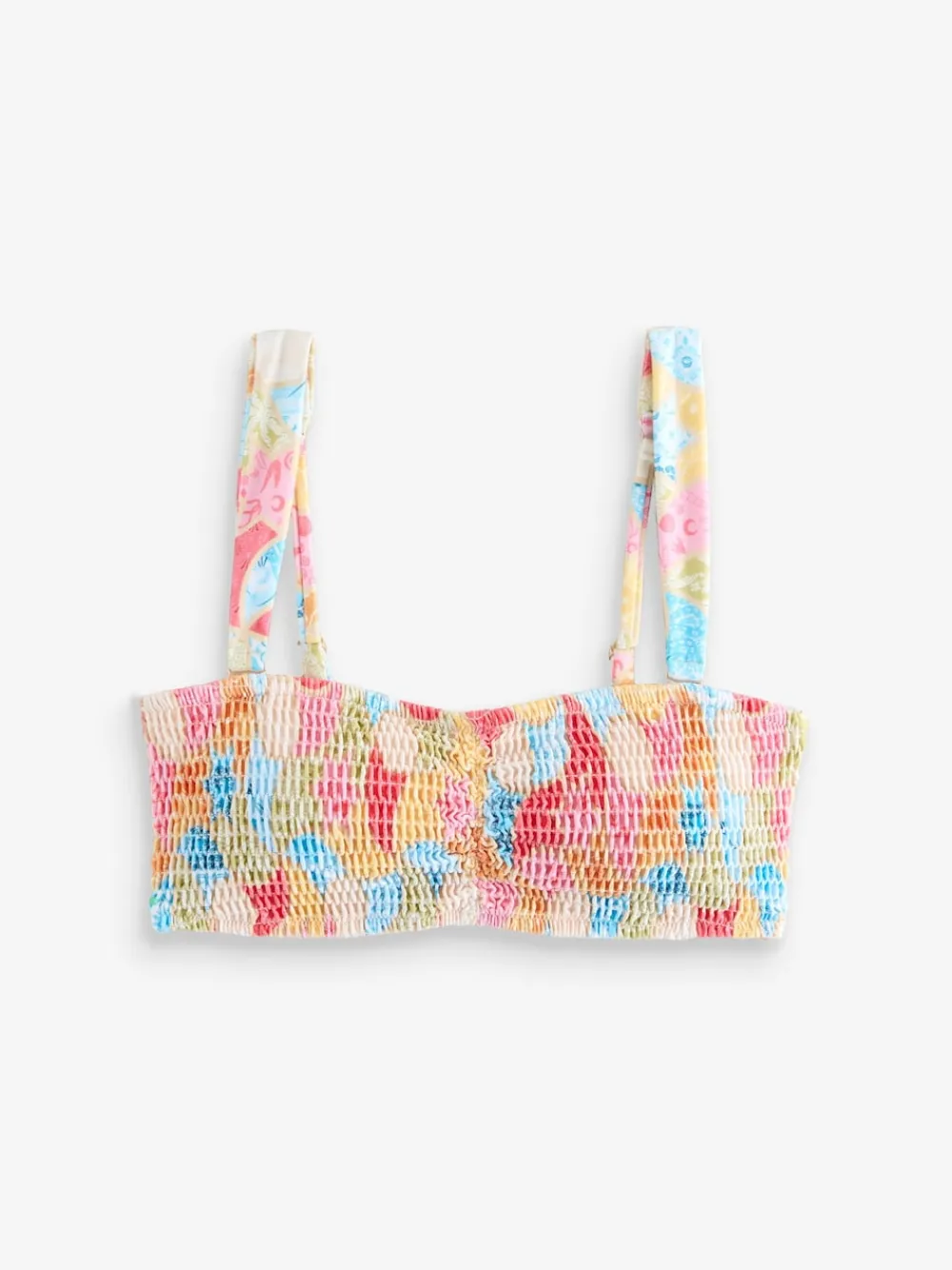Keep it colourful in this bright shirred bikini top from Never Full Dressed. Adorned in vibrant hues to spread the summer spirit, this bikini top is designed with elasticated shirred detailing for a comfy fit and adjustable straps. Pair with the matching bikini briefs for a complete set. Shirred design Adjustable straps Matching bikini bottoms available Machine washable. Main 84% Nylon, 16% Elastane. Lining 92% Recycled polyester, 8% Elastane.