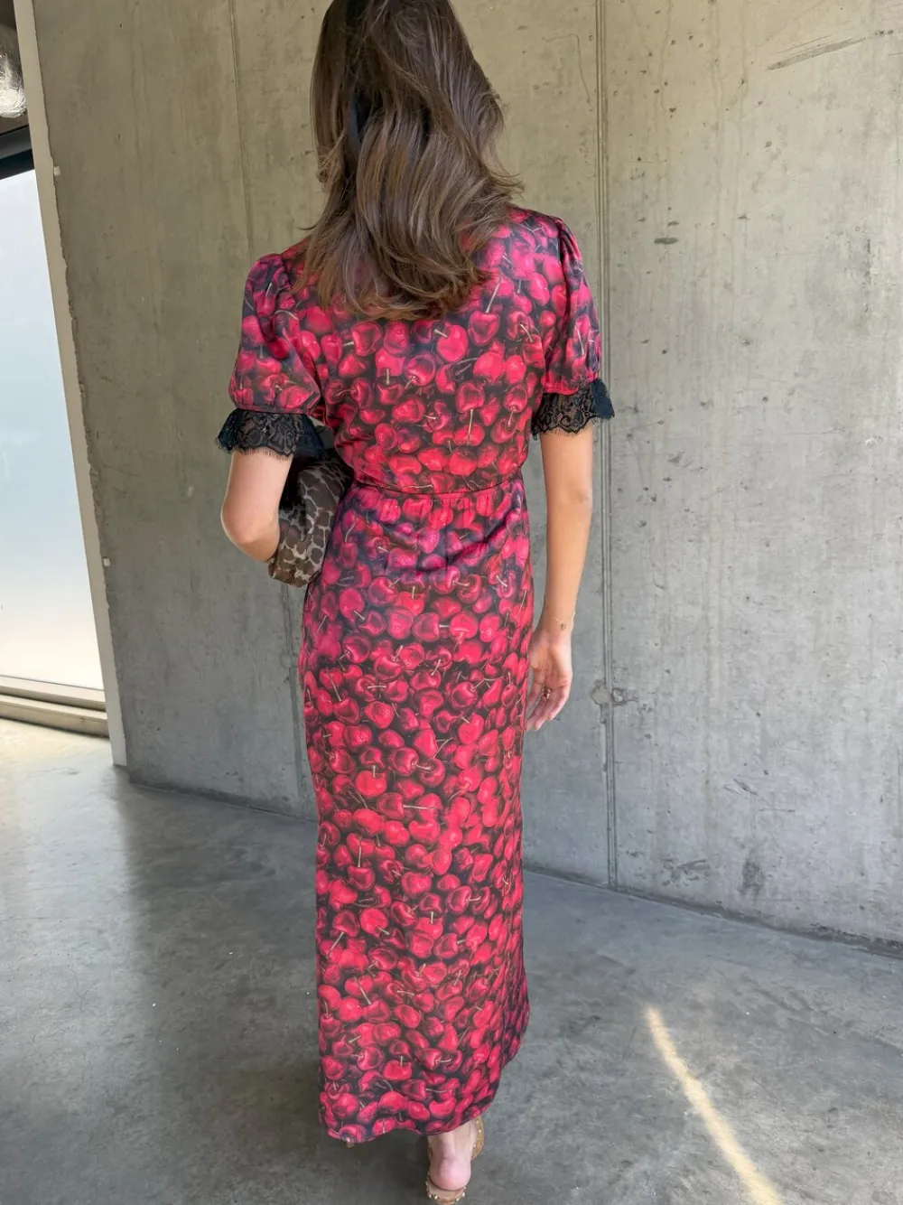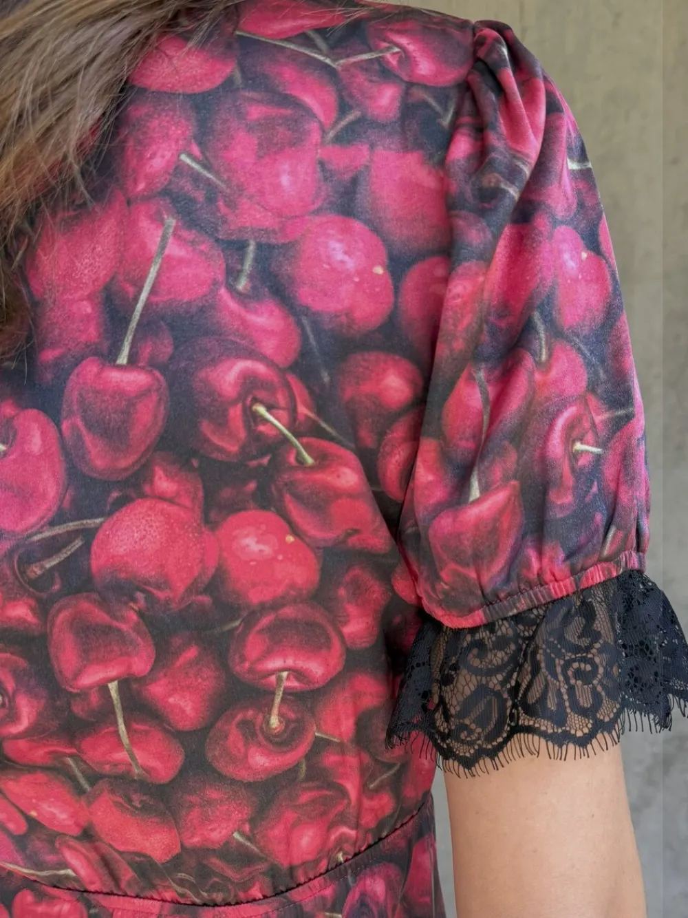 New Print for NFD An all-over cherry design with intricate lace detailing on the neckline and cuffs for a touch of texture. With tie neck detailing and pleating around the bust Elasticated sleeves for comfort The details on this dress make it a definite must-have for your autumn/winter wardrobe Machine washable. Main 100% Viscose. Lace 100% Nylon.