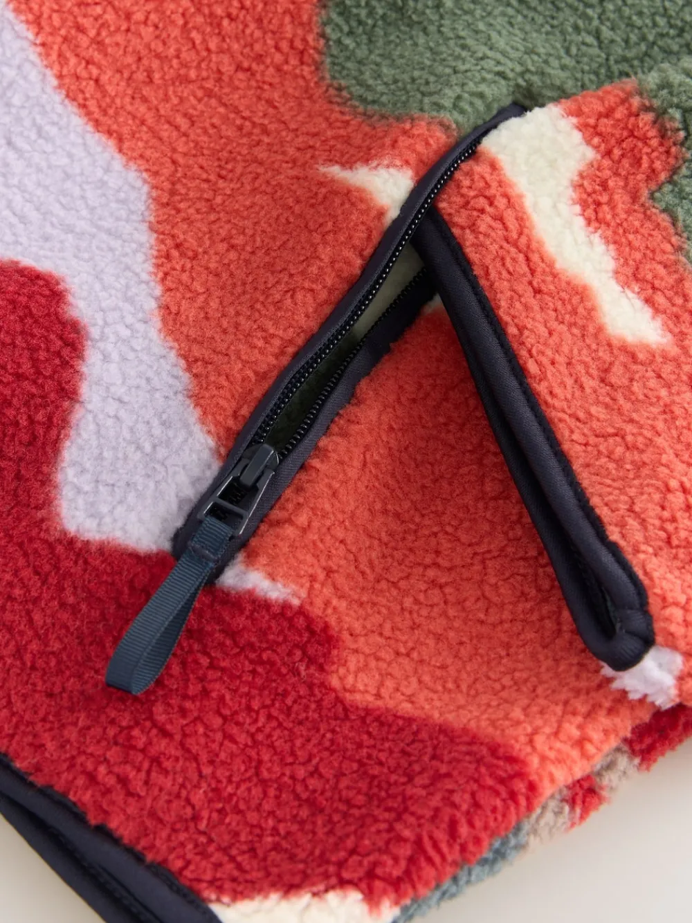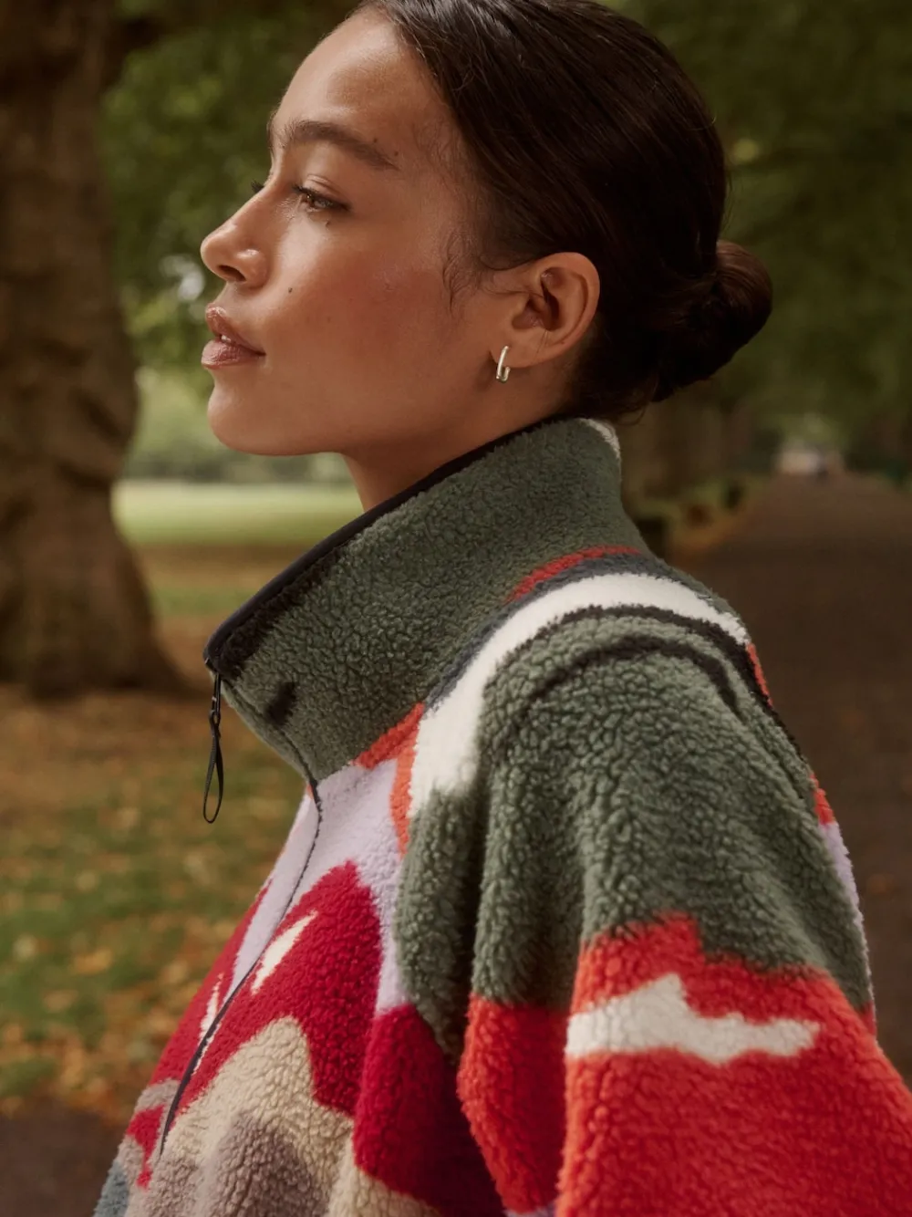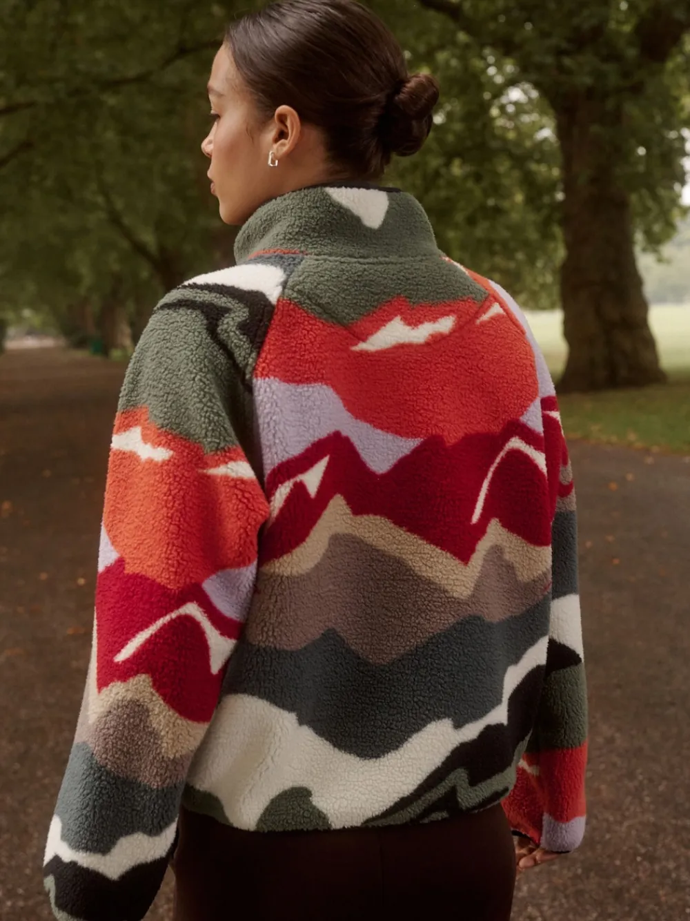 Stay warm during outdoor activities in this vibrant mountain print borg fleece jacket. Featuring a cosy quarter-zip fastening and practical fastened pockets, this piece is perfect for keeping warm during autumn and winter walks or workouts. Borg fleece fabric Mountain print Quarter zip fastening Fastened pockets Machine washable. 100% Recycled polyester.