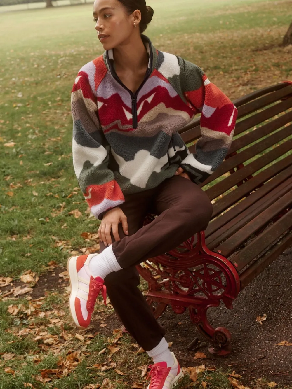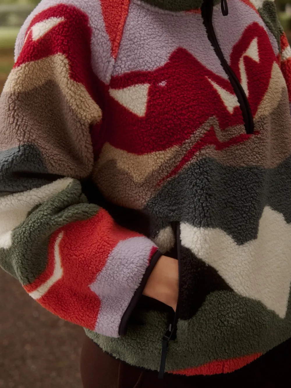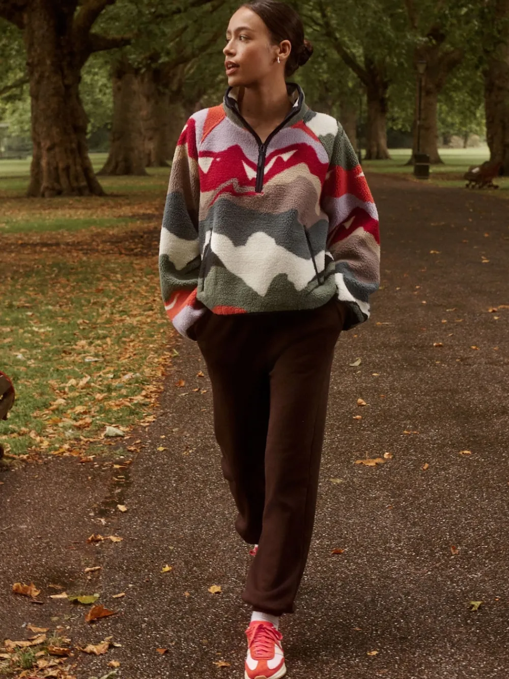 Stay warm during outdoor activities in this vibrant mountain print borg fleece jacket. Featuring a cosy quarter-zip fastening and practical fastened pockets, this piece is perfect for keeping warm during autumn and winter walks or workouts. Borg fleece fabric Mountain print Quarter zip fastening Fastened pockets Machine washable. 100% Recycled polyester.