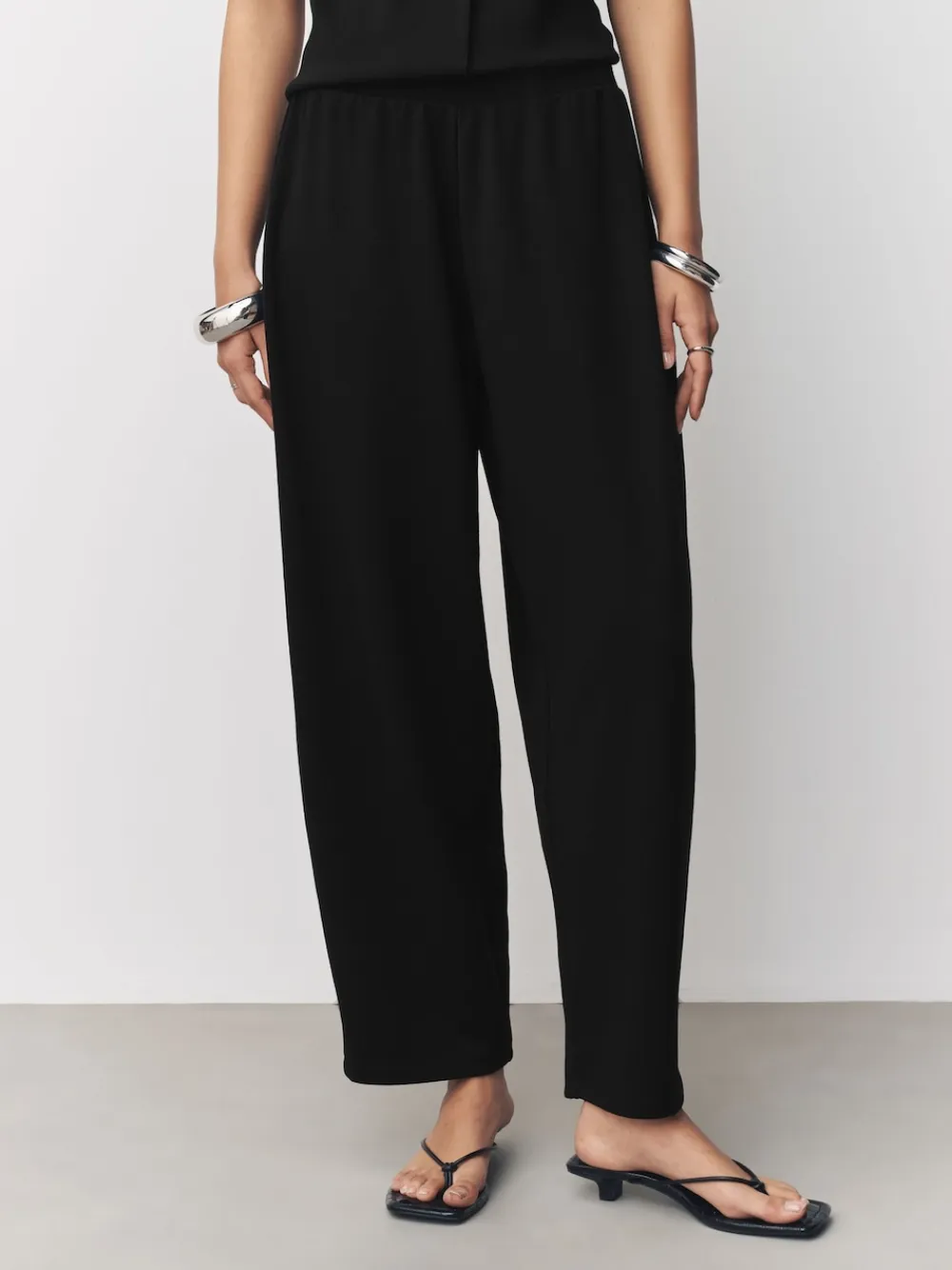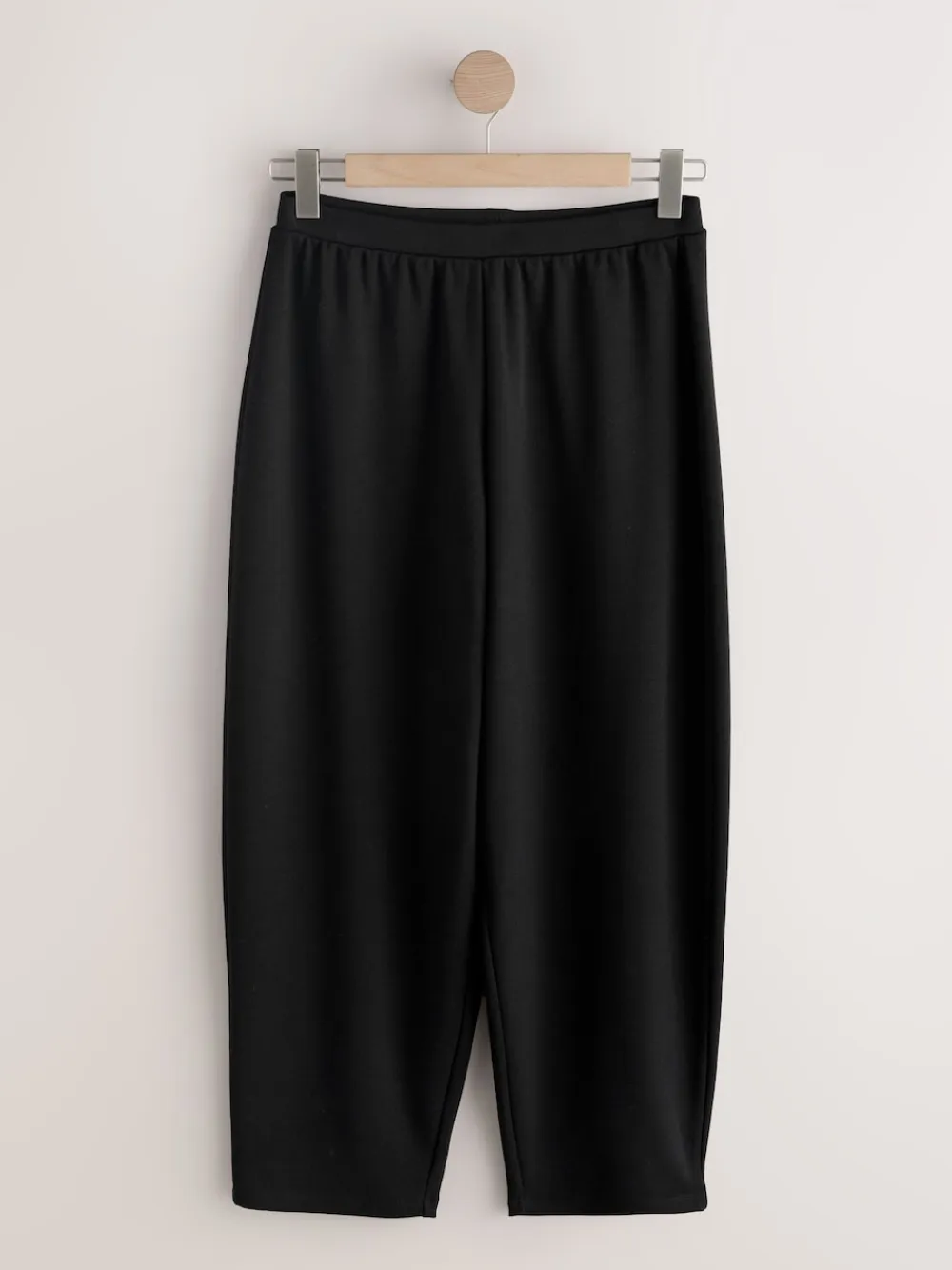 Achieve relaxed yet refined style with these versatile black trousers. The fashionable barrel leg silhouette offers a comfortable fit that tapers towards the ankle, making them easy to dress up or down for any smart-casual occasion. Barrel leg style Cropped ankle length Versatile compact fabric Short to fit inside leg 27″ / 69cm. Regular to fit inside leg 29″ / 74cm. Long to fit inside leg 31″ / 79cm. Machine washable. 67% LENZING™ ECOVERO™ Viscose, 29% Recycled polyester, 4% Elastane. Items with the curve logo are available in sizes 18 and above.