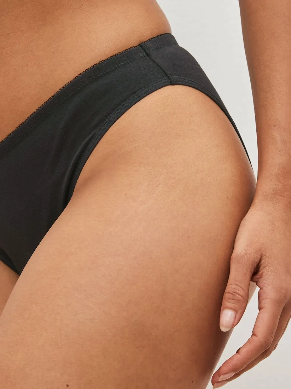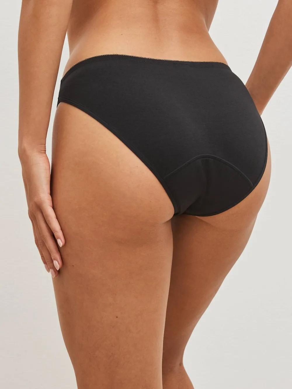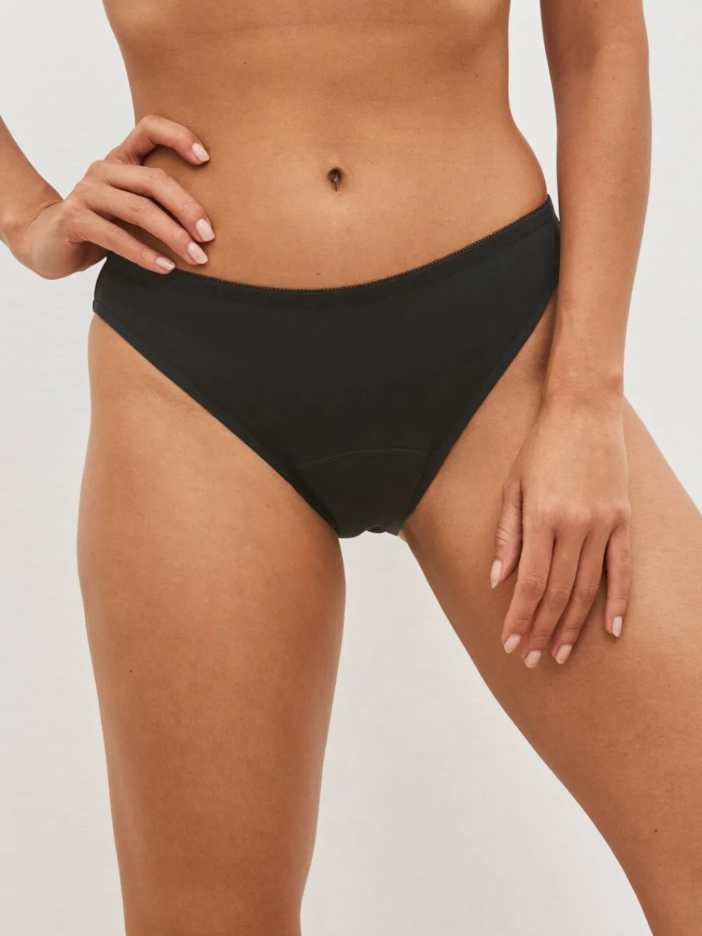 Black Medium Flow – can be used on its own or as part of your usual routine on heavier days. Holds up to 18 ml/approx 2-3 regular tampons. Four-layer protection keeps you dry and comfortable. Simply wash and wear. Wash before wearing for the first time to achieve the maximum absorbency, do not use fabric softener and hang to dry. Supersoft comfortable fabric. Pack of 3 Supersoft comfortable fabric Four-layer protection High leg Suitable for medium flow Please Note: This product contains the biocide silver chloride (redefined from reaction mass of titanium dioxide and silver chloride) Machine washable. 3 x Knickers Main 95% Cotton, 5% Elastane. Gusset 65% Polyester, 35% Cotton. Items with the curve logo are available in sizes 18 and above.