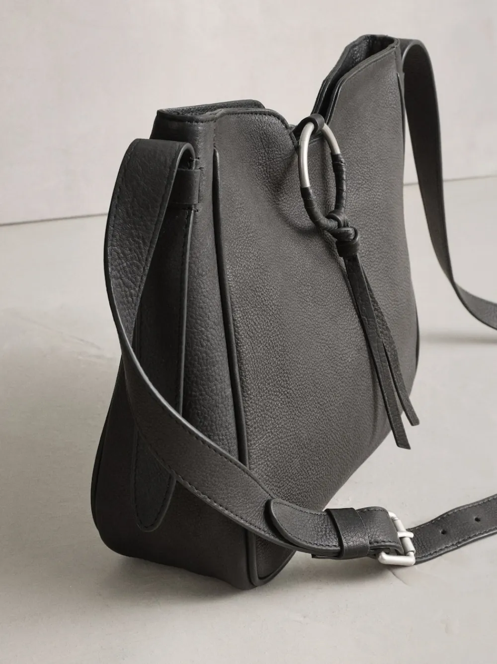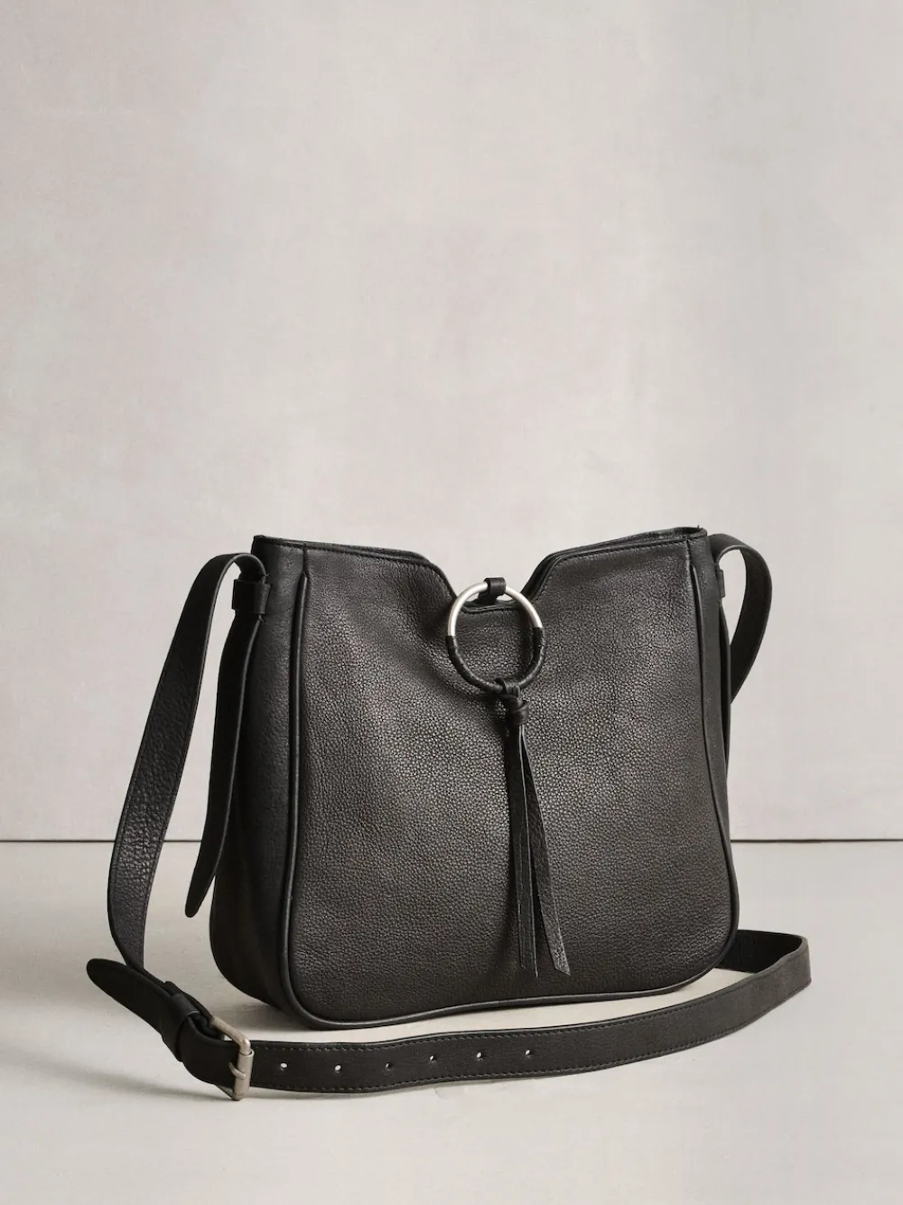 Complete your look with this sophisticated black leather messenger bag. Featuring an adjustable cross-body strap and smart metal ring detail, it offers effortless style and practical capacity. An essential accessory for versatile, everyday wear. Leather outer Cross-body style Adjustable strap Metal ring detail Main 100% Leather. Lining 100% Cotton.