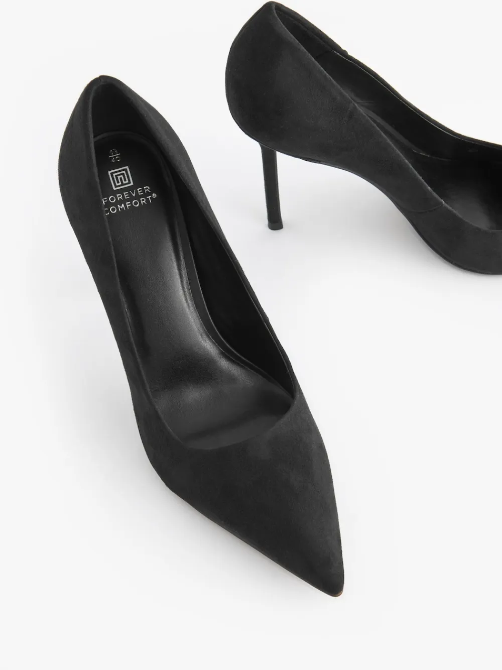 These stylish black heeled court shoes feature a smooth faux suede upper with a pointed toe and back counter padding, boasting a Forever Comfort® cushioned footbed for added comfort. A stiletto heel adds a touch of class to this elegant shoe. Faux suede upper Pointed toe Forever Comfort® footbed Padded back counter Stiletto heel Heel height 10.5cm. Upper – Textile, Lining & Sock – Other Materials, Sole – Other Materials.