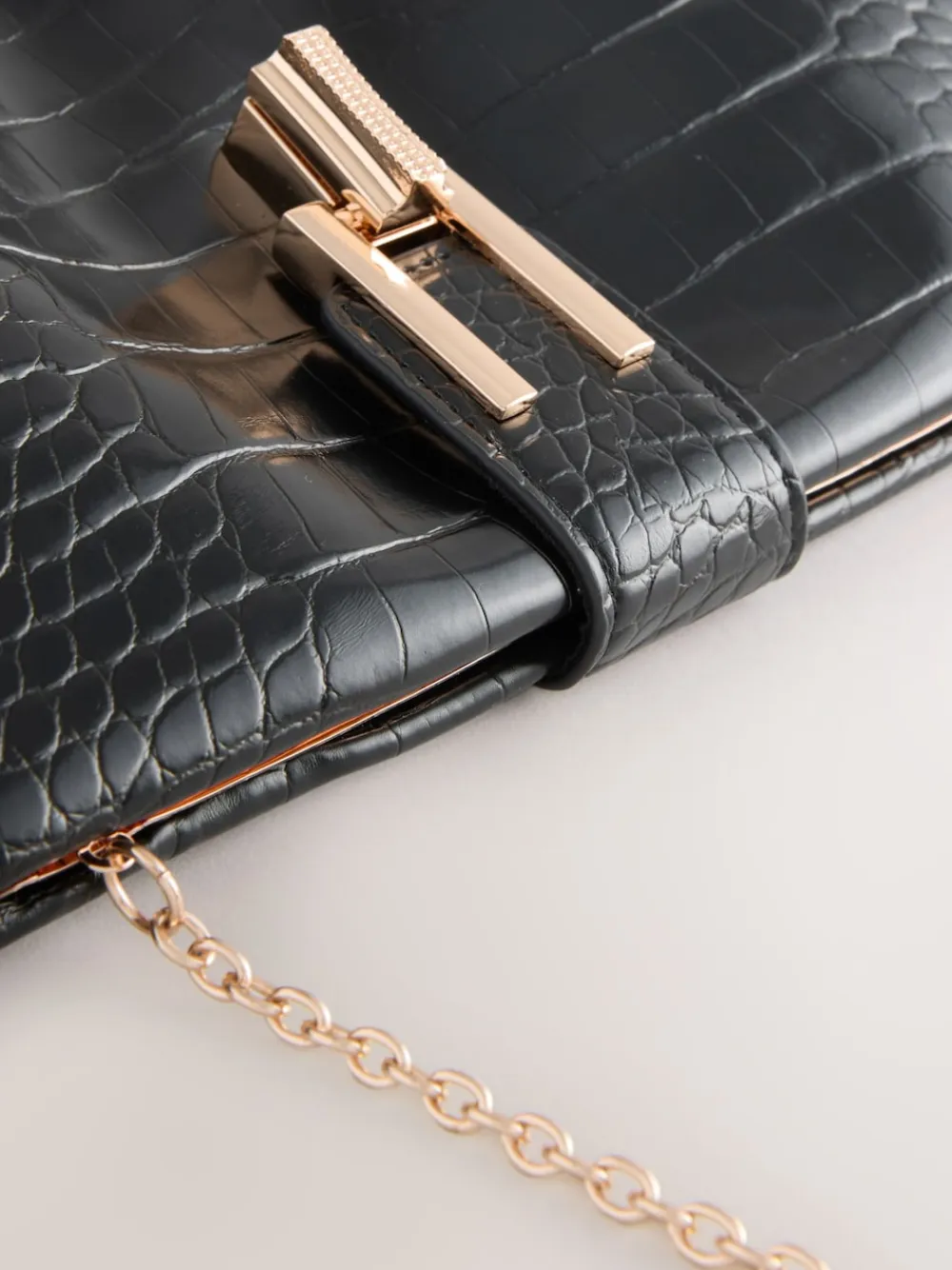 Complete your evening look with this black croc-effect clutch bag. The PU material and stylish croc print offer a luxurious texture and a modern feel, while the sleek shape makes it the perfect accessory for a night out or a special occasion. For versatile wear, it comes with an optional gold-toned chain strapCroc-effect print PU material Optional chain strap Snap closure Structured clutch bag Height 13cm Width 25cm Depth 7cm Outer 100% PU. Lining 100% Recycled polyester.