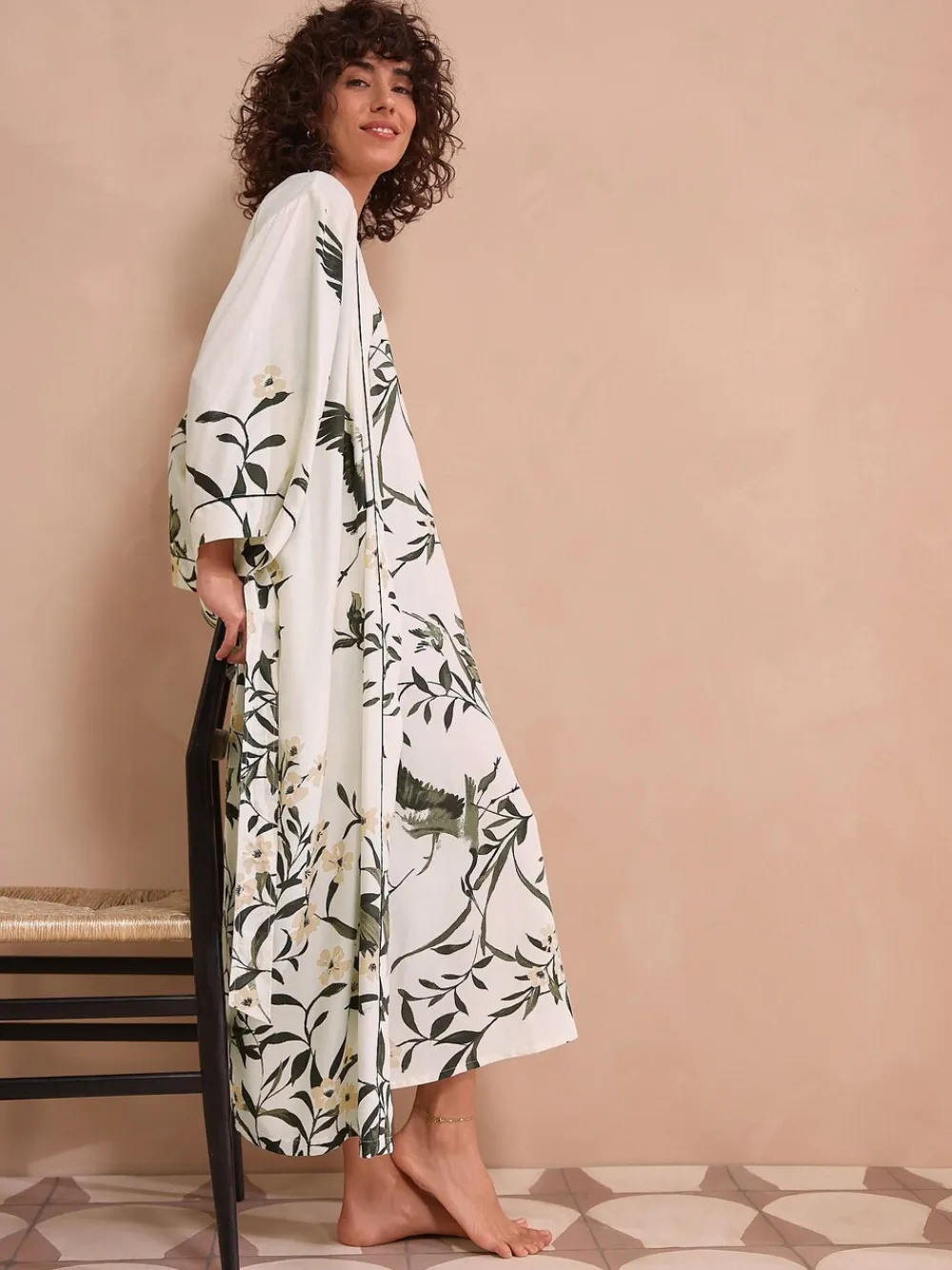 Comfortable, lightweight and elegant, this dressing gown features an all-over floral print and a longline shape, with added linen and a tie waist. Ideal for lounging at home or on holiday. Lightweight Longline Added linen Floral print 85% LENZING™ ECOVERO™ Viscose, 15% Linen. Warning: Keep away from fire and flames.