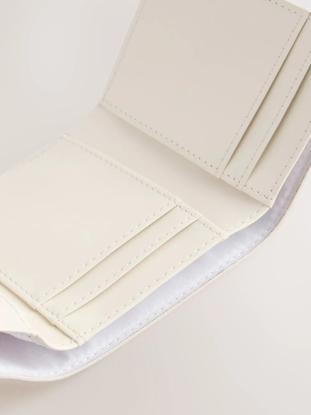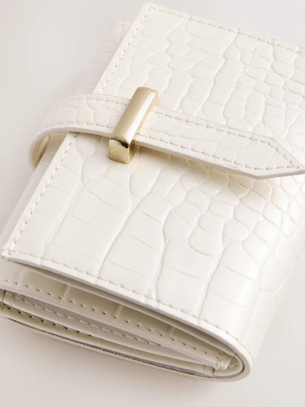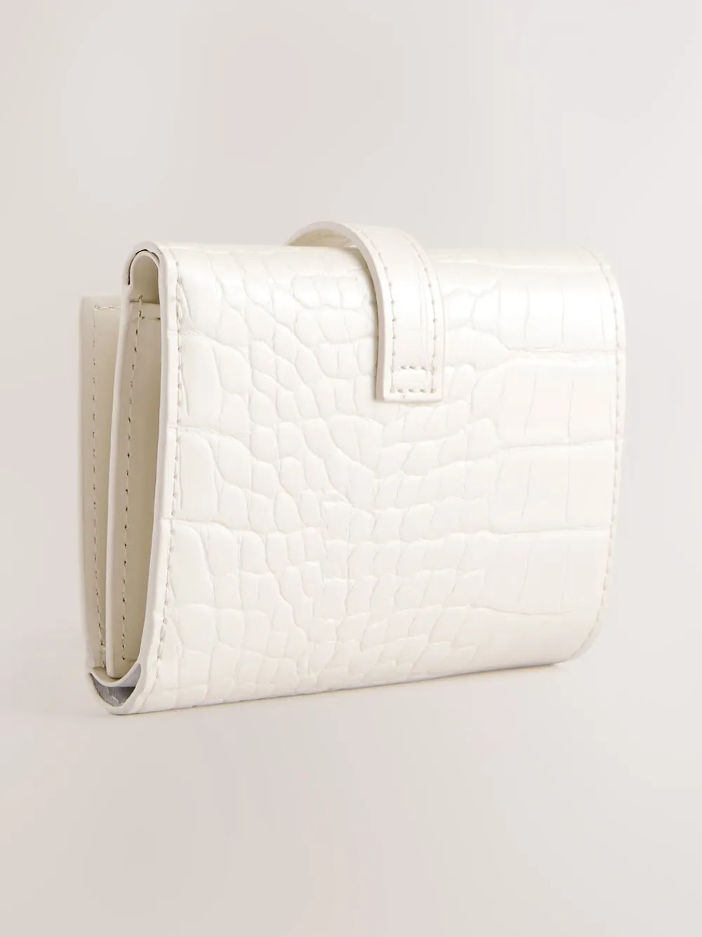 In a bone white faux leather with a crocodile-style texture, this stylish purse features multiple card slots with a strap fastening and gold-tone hardware detailing, finished with a zippered internal pocket for coins. Faux leather Crocodile pattern Strap fastening Gold-tone hardware Outer 100% Polyester with PU coating. Lining 100% Recycled polyester.