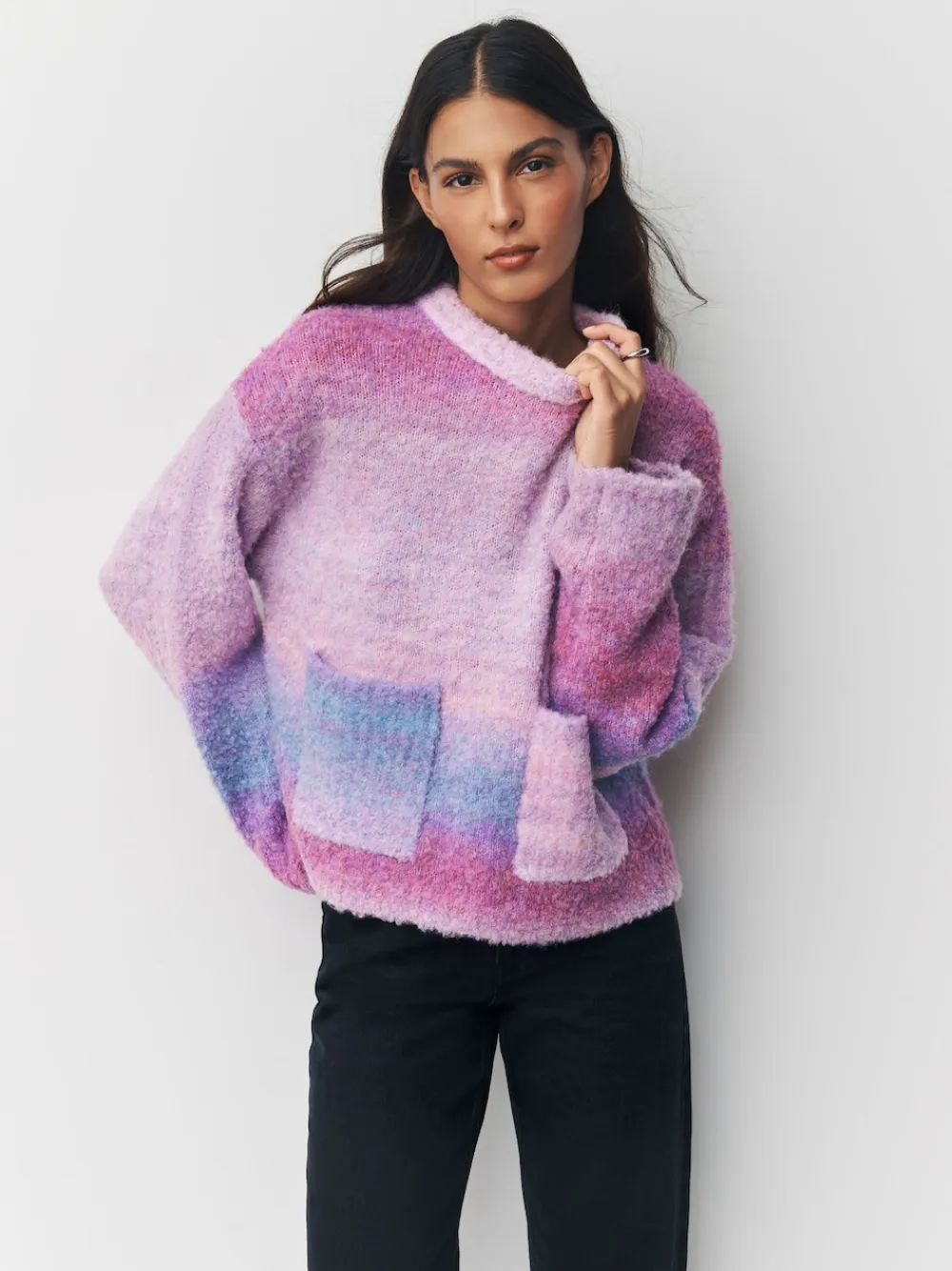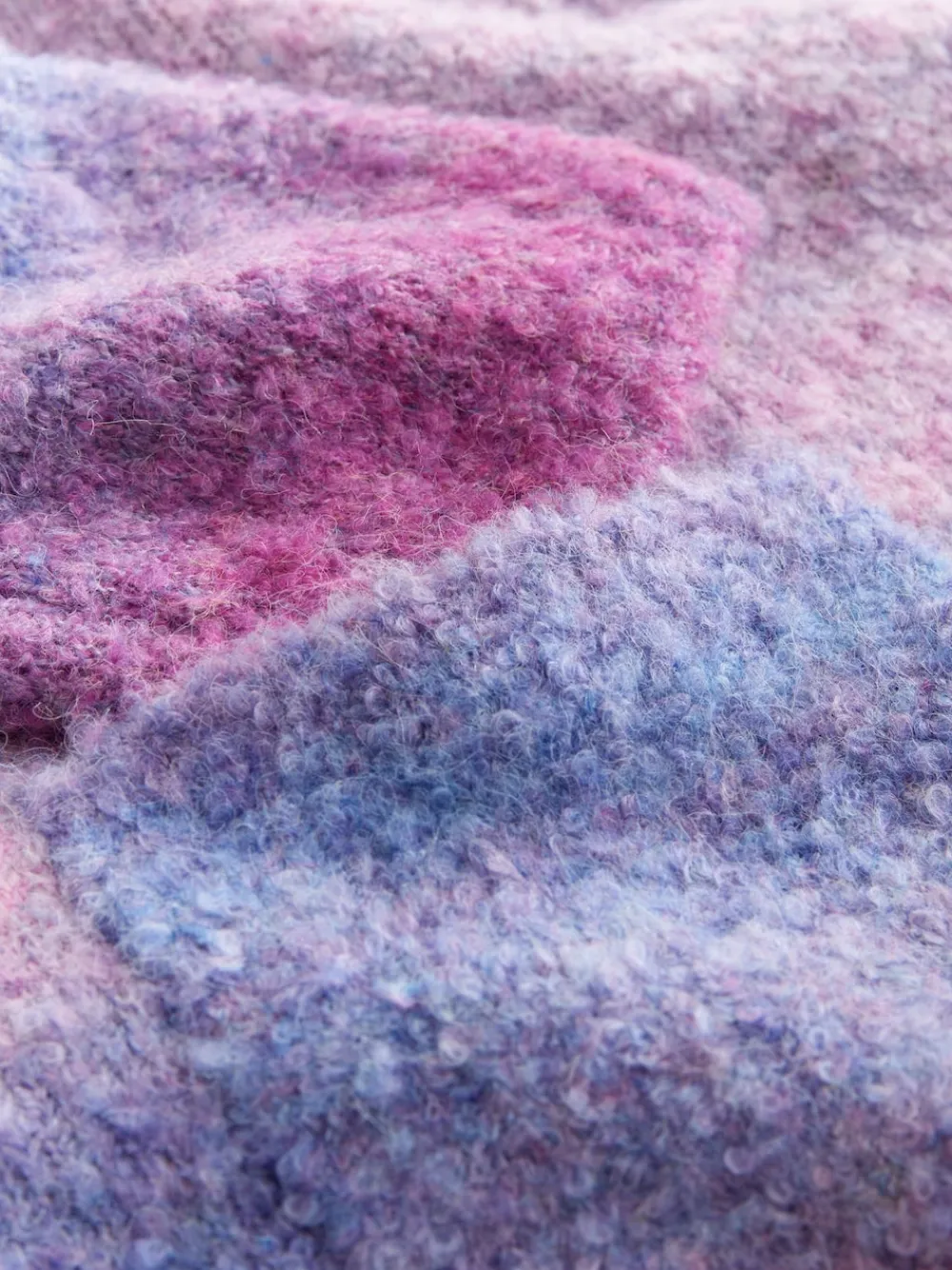 Add a splash of vibrant texture to your knitwear collection with this pink and purple spacedye jumper. Crafted from a cosy boucle yarn with a touch of wool, this piece features a beautiful gradient effect in shades of lilac, violet, and magenta. The relaxed design is finished with a classic crew neckline and two practical front patch pockets, offering both chic style and everyday comfort. Boucle spacedye Soft knit fabric with wool blend Classic crew neck design Two functional front pockets Vibrant multi-tonal pink and purple spacedye pattern Machine washable. 59% Recycled polyester, 29% Acrylic, 9% Wool, 3% Elastane.